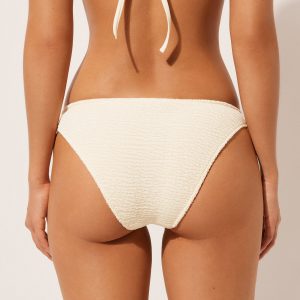 Unpadded balconette bikini top with underwire. The structure of the cups perfectly embraces and supports the bust, while the side drawstring can adjust the fit. Ideal for larger busts. The style features a crinkle fabric with a three-dimensional effect. Adjustable straps and thin tie closure on the back.