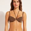 Unpadded balconette bikini top with underwire. The structure of the cups perfectly embrace and support the bust, thanks to the side drawstring on the cups that can also adjust the fit. Ideal for the larger bust. The style features a bright fabric with a silky effect, embellished by ruffles and gold tips. Adjustable straps and hook closure with two adjusters.