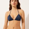 Unpadded balconette bikini top with underwire. The structure of the cups perfectly embrace and support the bust, thanks to the side drawstring on the cups that can also adjust the fit. Ideal for the larger bust. The style features a bright fabric with a silky effect, embellished by ruffles and gold tips. Adjustable straps and hook closure with two adjusters.