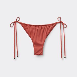 Brazilian cut bikini bottom with side ties to adjust the fit. The style features a bright fabric with a silky effect, embellished by ruffles and gold tips. Fully lined with invisible seams.