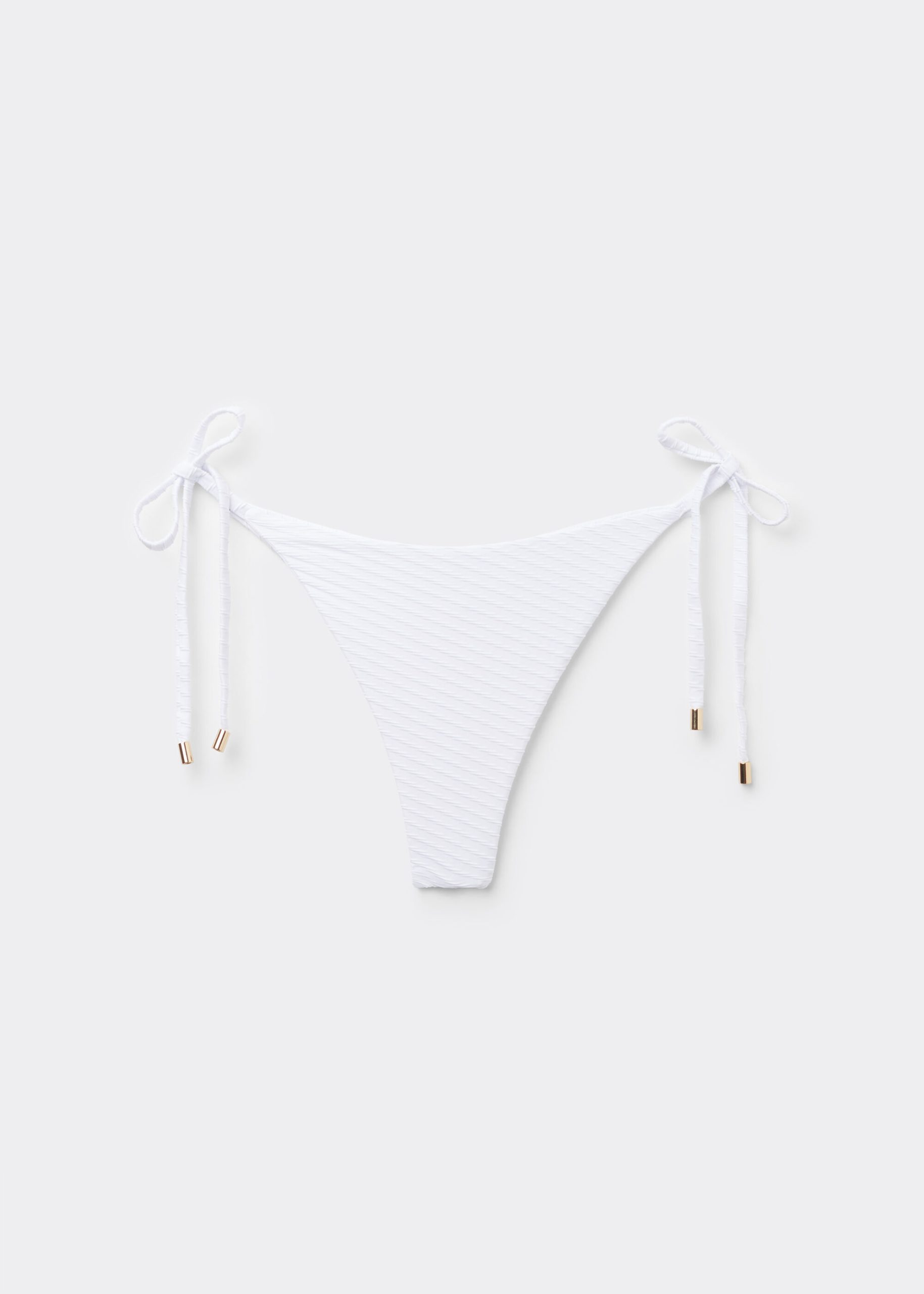 Brazilian bikini bottoms with thin side ties to adjust the fit. The slightly rounded waist at the front allows for both a classic or more high-cut fit, depending on one’s physique. The style features three-dimensional especially soft fabric with diagonal motif. Fully lined with invisible seams.