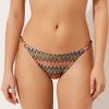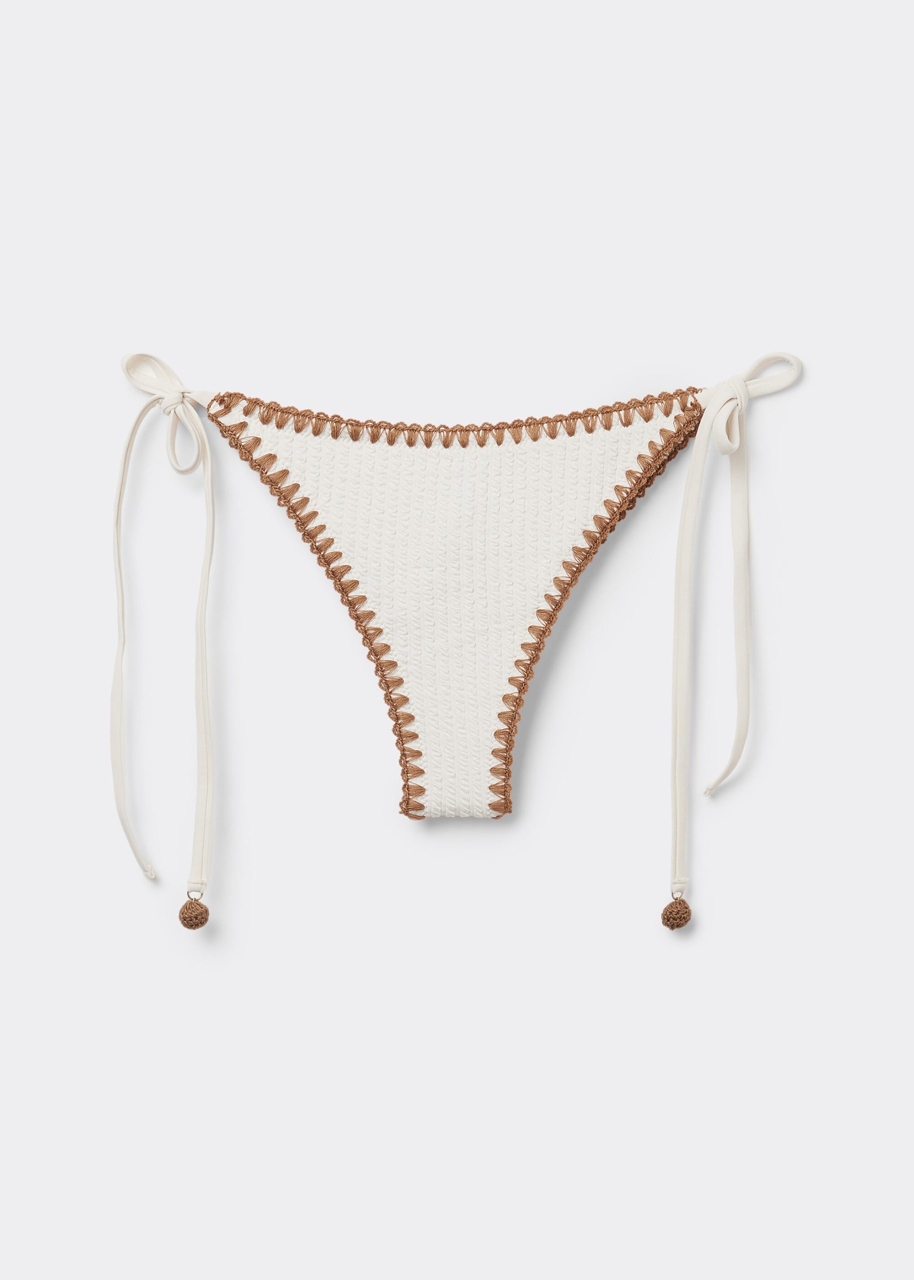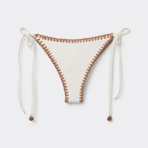 Brazilian cut bikini bottom with side ties to adjust the fit. The slightly rounded waist at the front allows for both a classic or more high-cut fit, depending on one’s physique. The style features a crinkle fabric embellished with contrast color embroidery. Fully lined. Back gathered seam for a better fit.