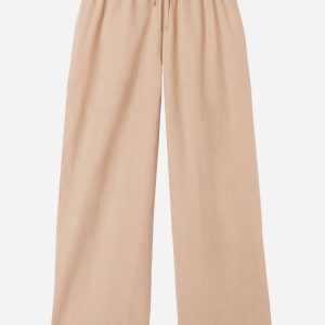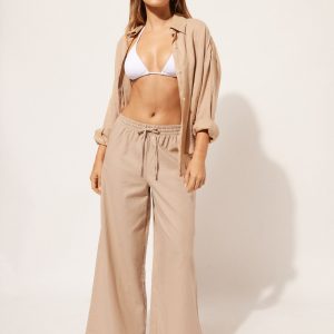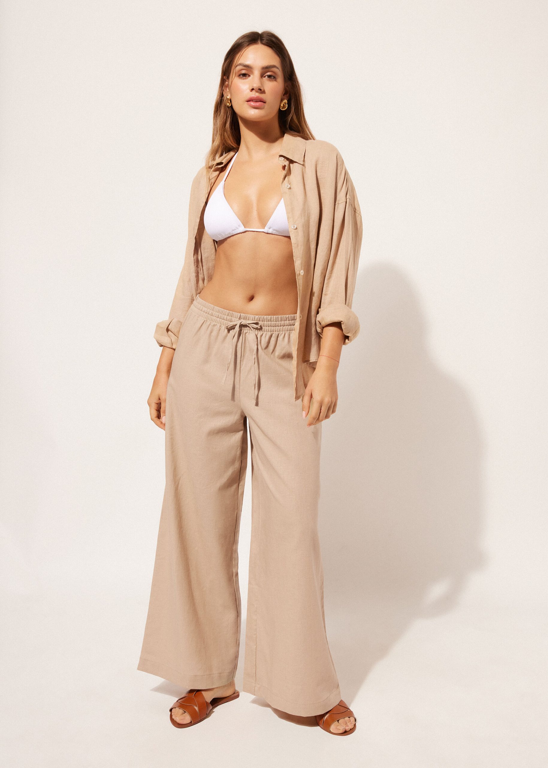 Cotton and linen pants with comfortable drawstring at the waistband. Palazzo style. Available in different colors that match the beachwear collection.