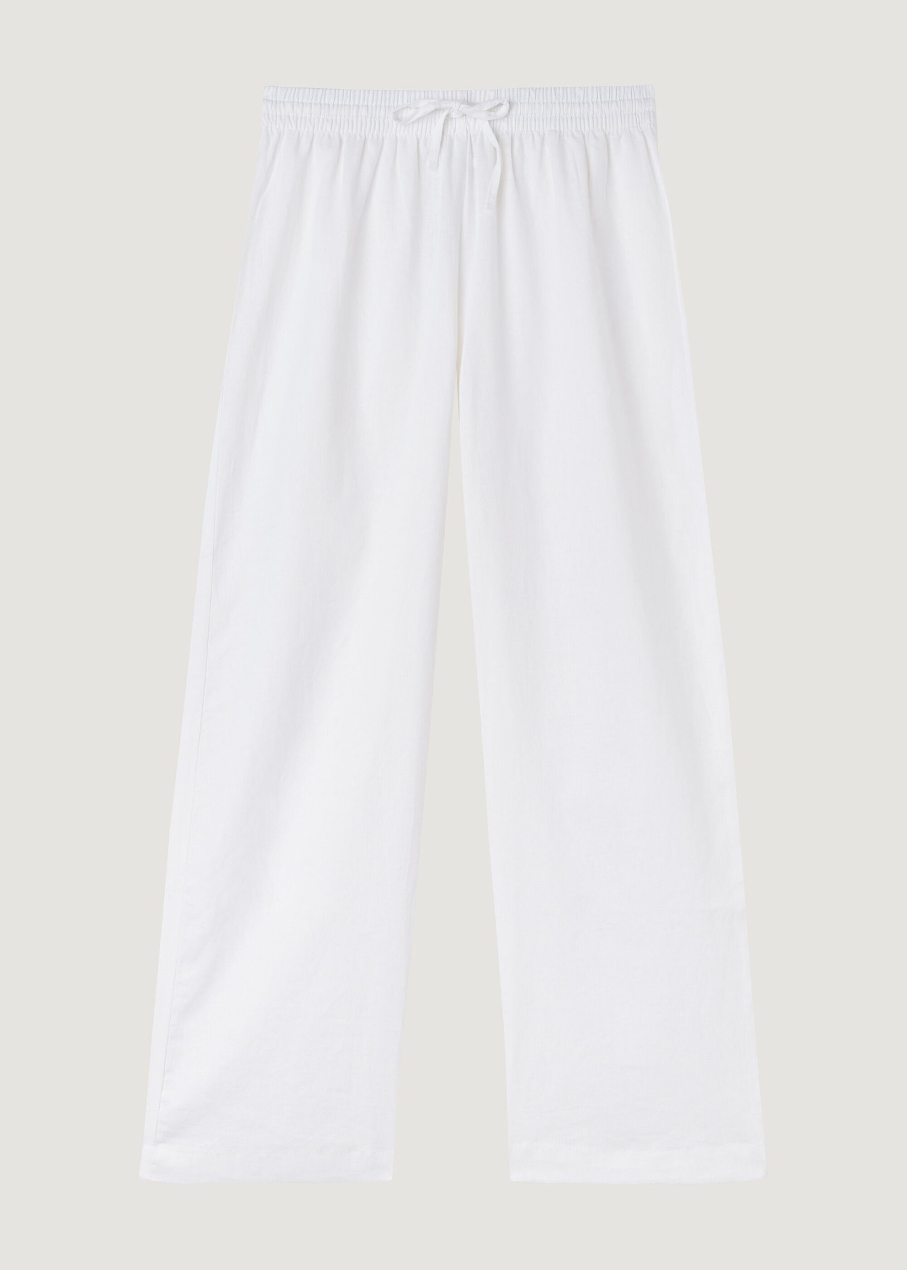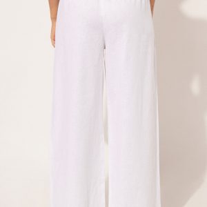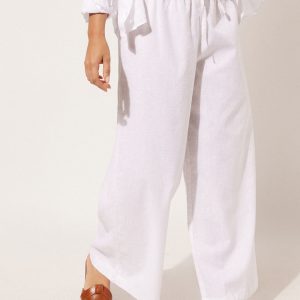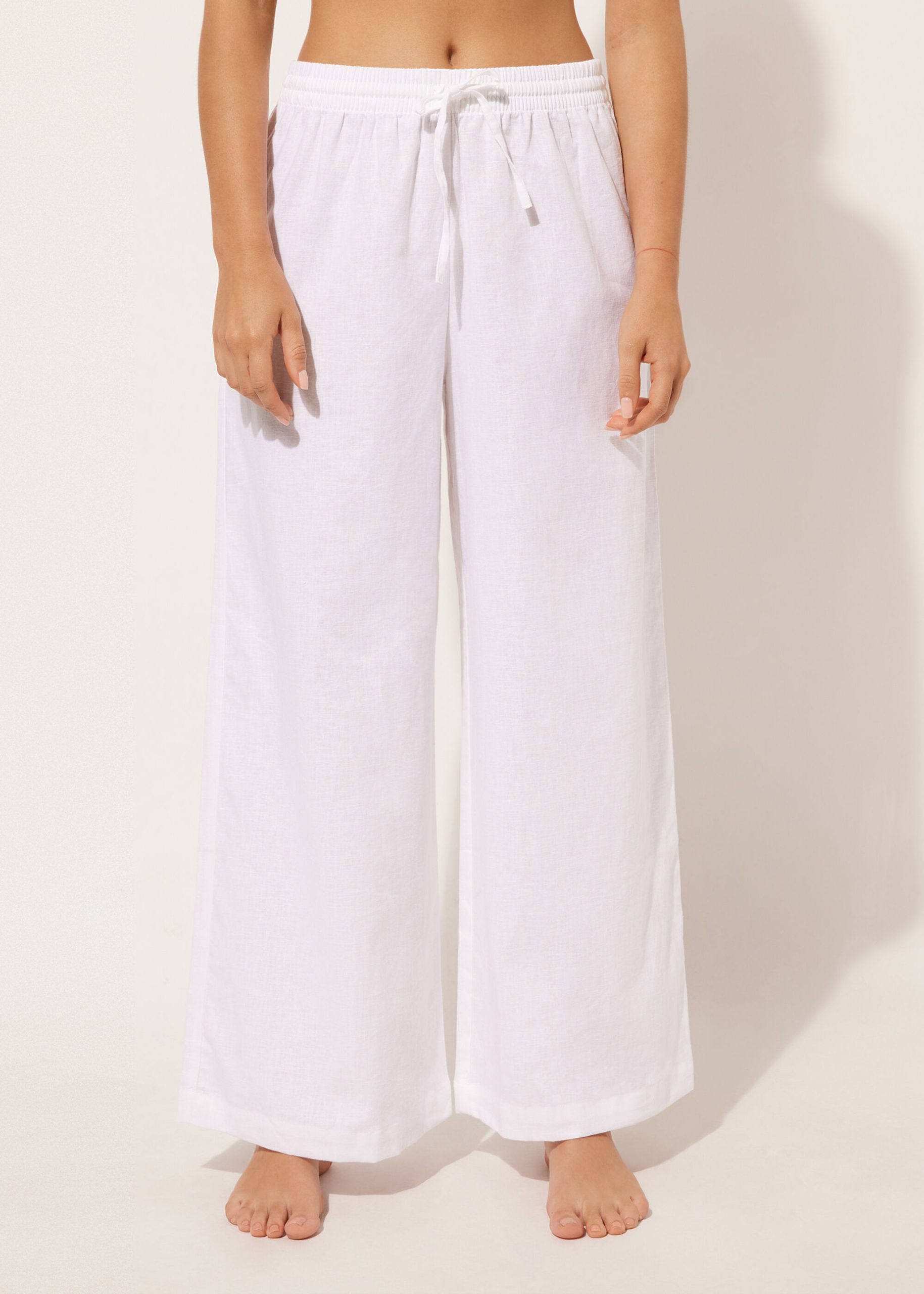 Cotton and linen pants with comfortable drawstring at the waistband. Palazzo style. Available in different colors that match the beachwear collection.
