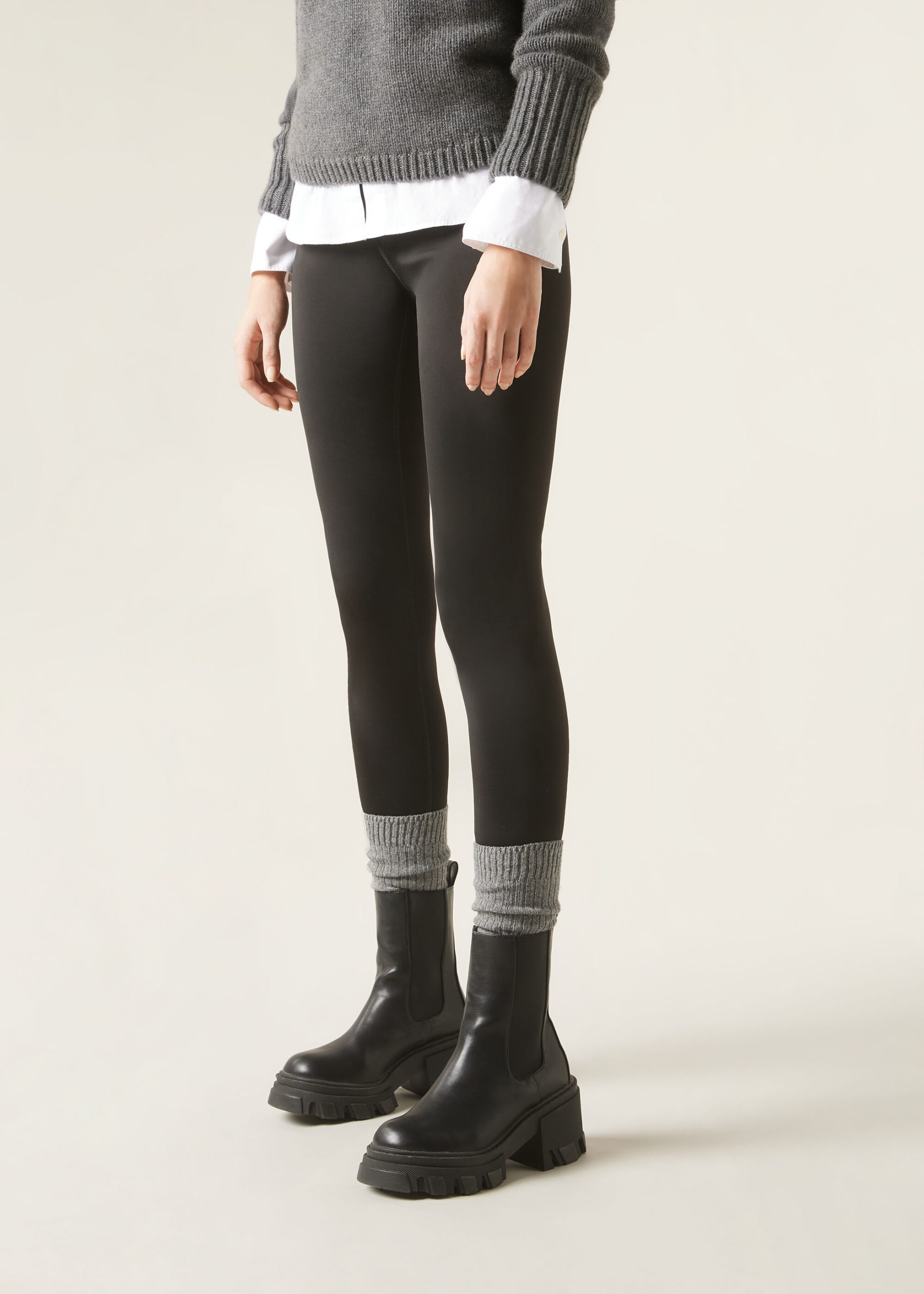 Thermal leggings made in double faced fabric. On one side the texture appears uniform and smooth, on the other it is especially soft and slightly fuzzy: the double faced fabric lets you wear them on either side. Comfortable waistband.