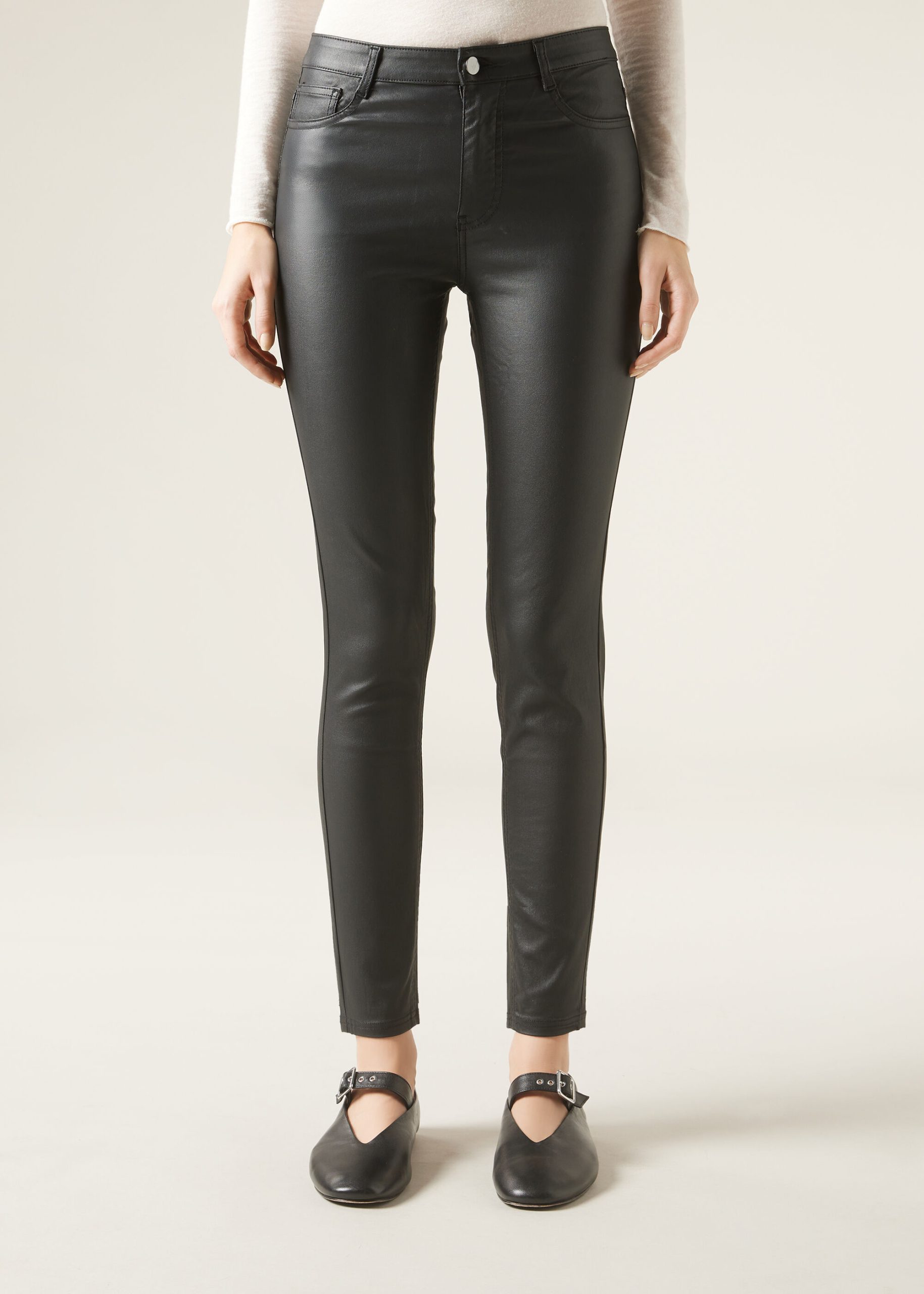 Faux leather five pocket leggings with actual front and back pockets. Zip and button closure. Skinny fit.