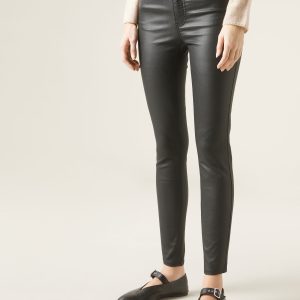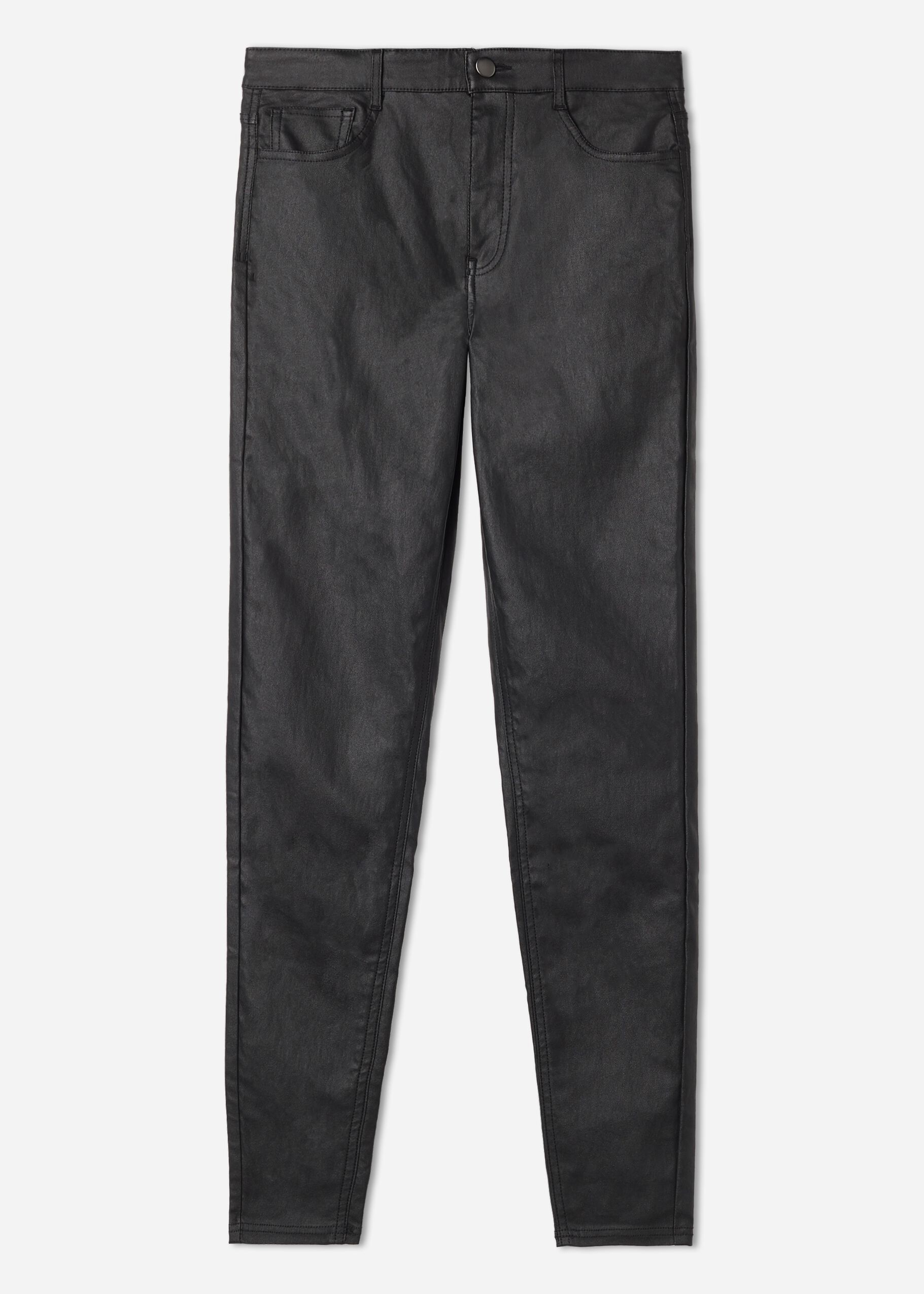 Faux leather five pocket leggings with actual front and back pockets. Zip and button closure. Skinny fit.