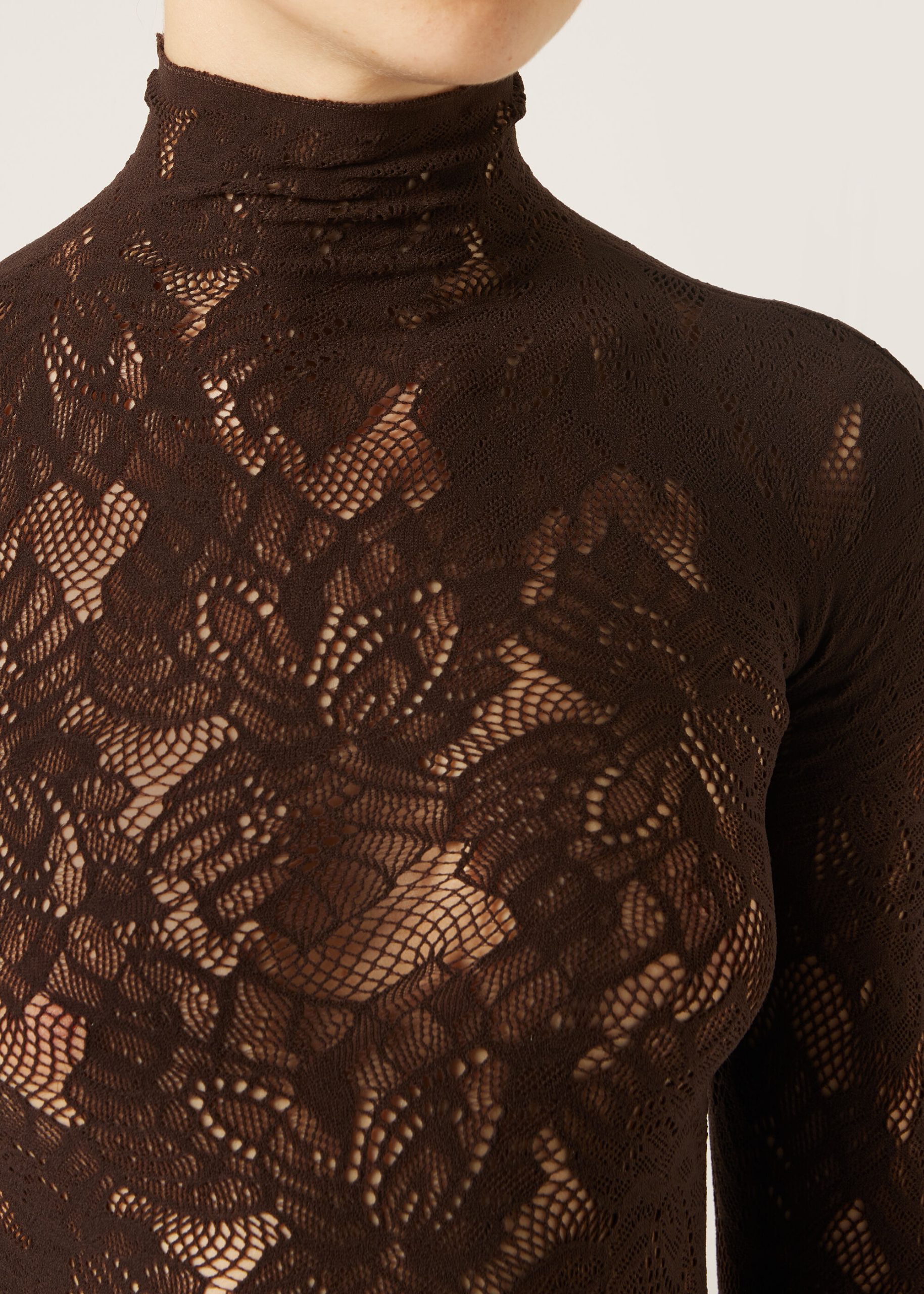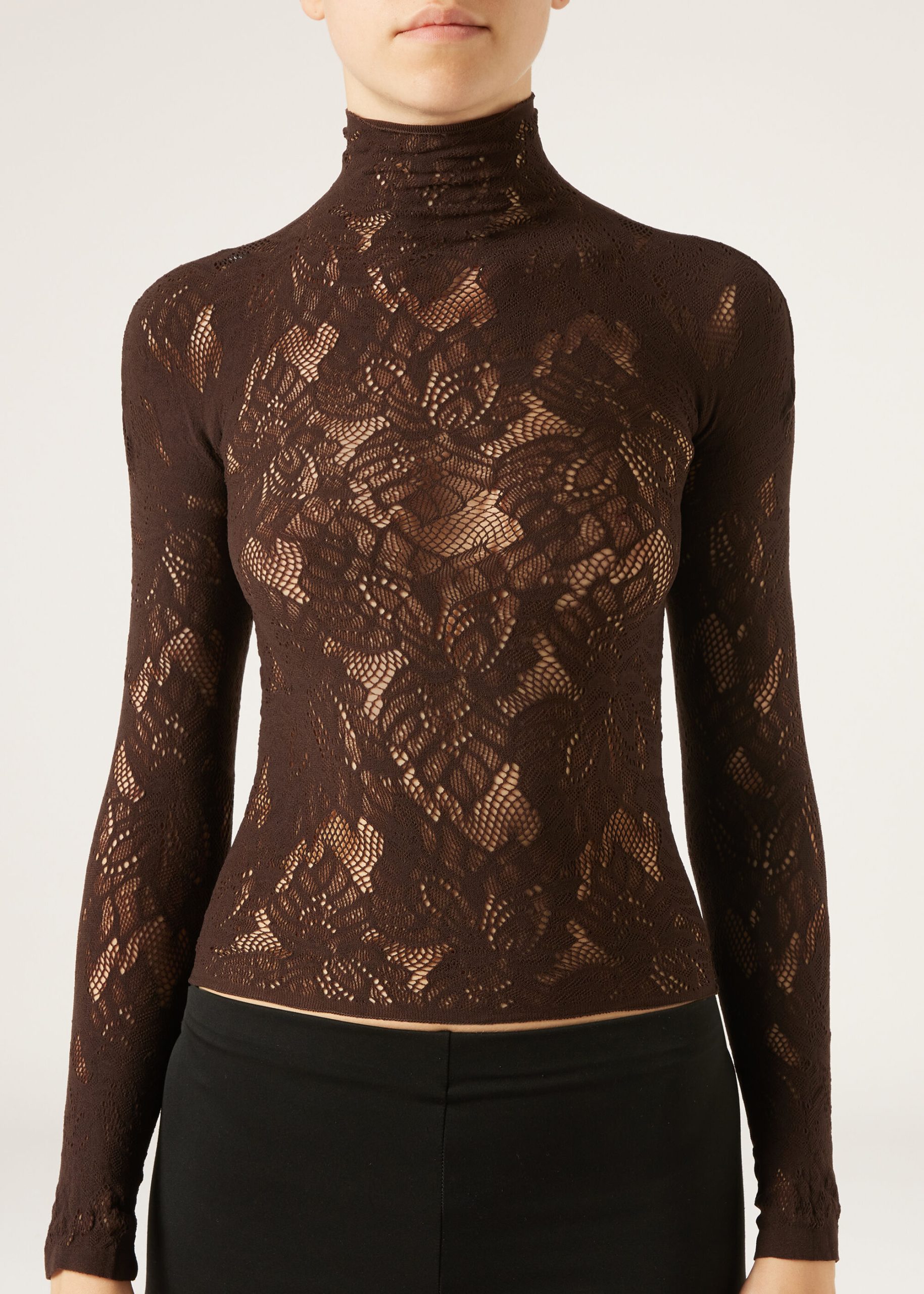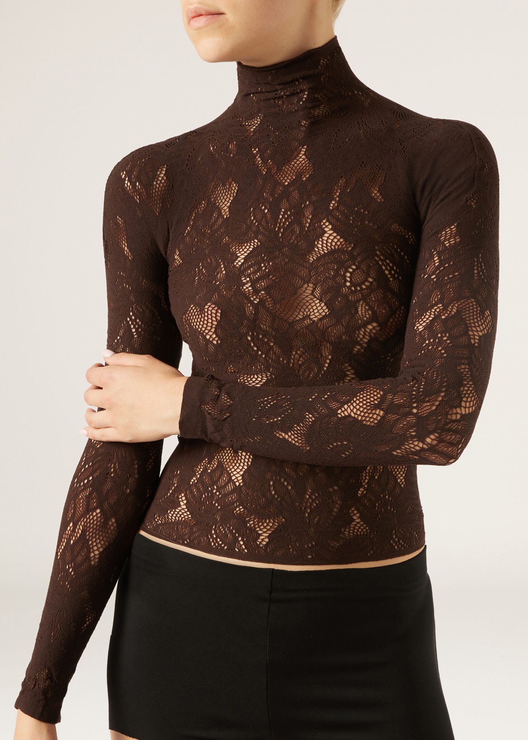 Floral motif mesh top, perfect to pair with coordinating tights MODC2185. With a funnel neckline and long sleeves, it is the ideal ally for an elegant and sophisticated look, even under a jacket.