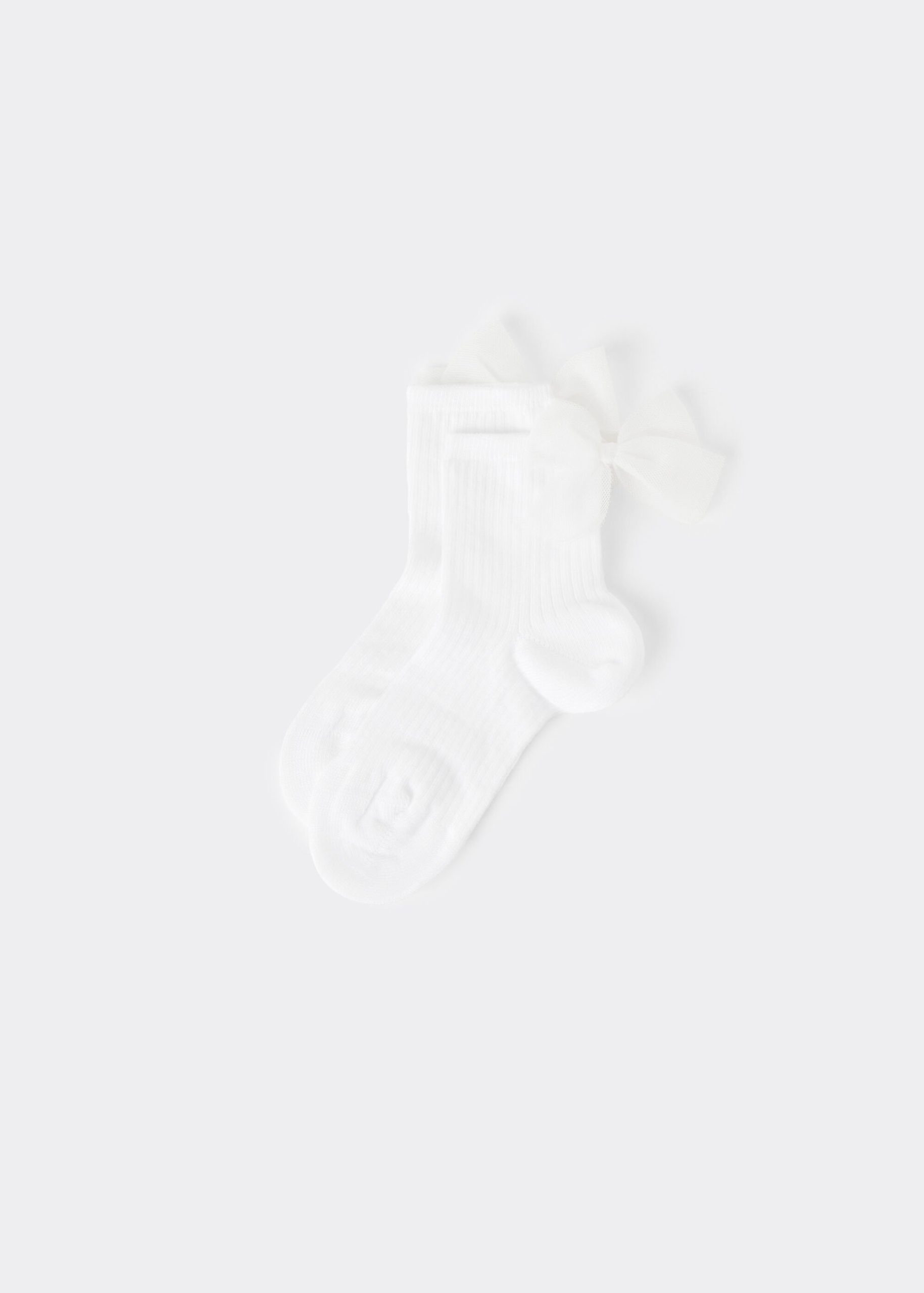 Girls’ short soft cotton socks featuring a ribbed construction and an elegant bow appliqué.