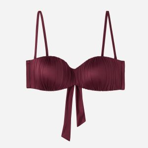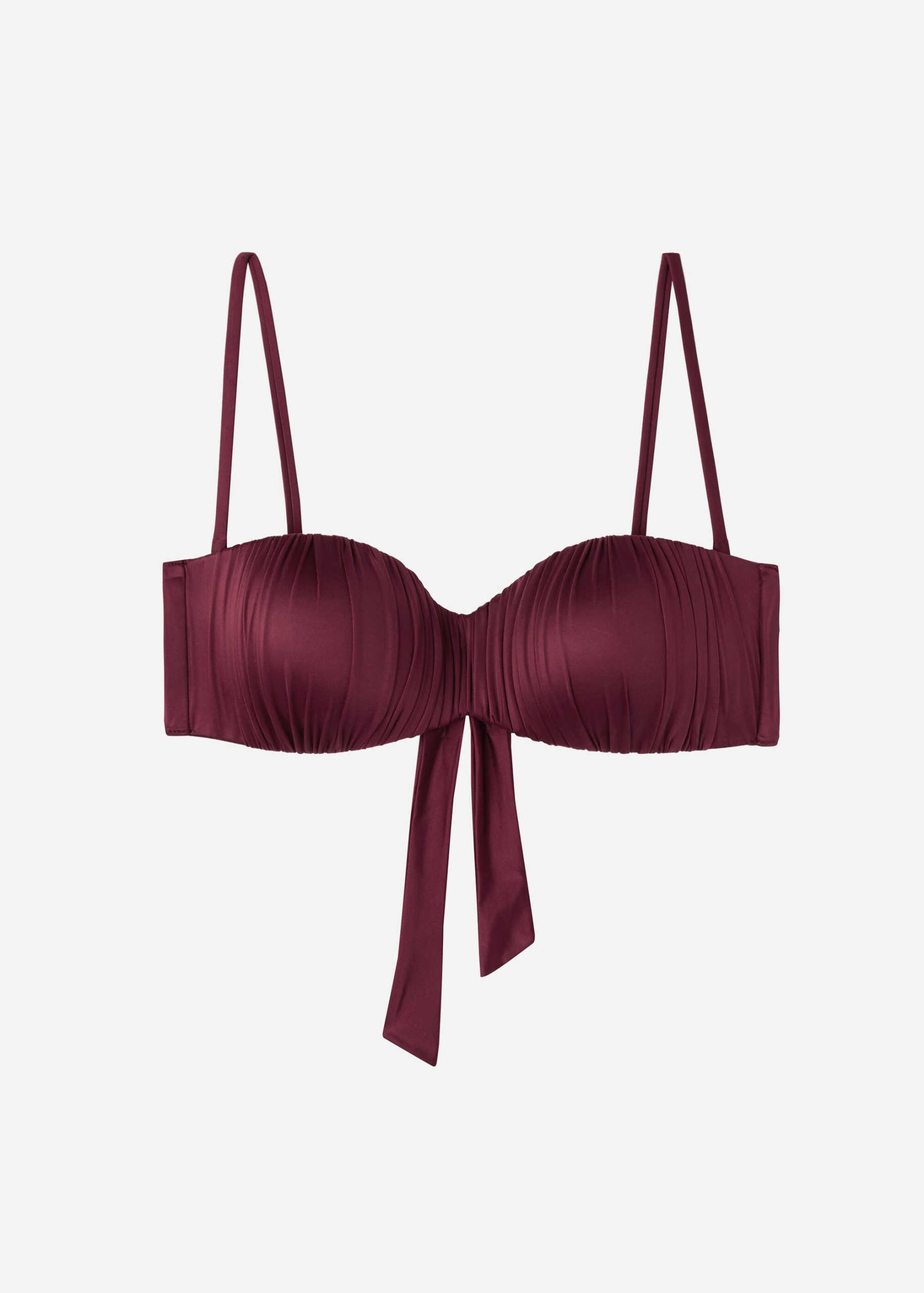 Bandeau bikini top with underwire, graduated padding cups, and side boning to guarantee good support, perfect for those with larger busts. The style features a bright fabric with a silky effect with ruffles. Adjustable and removable straps. Back tie closure.