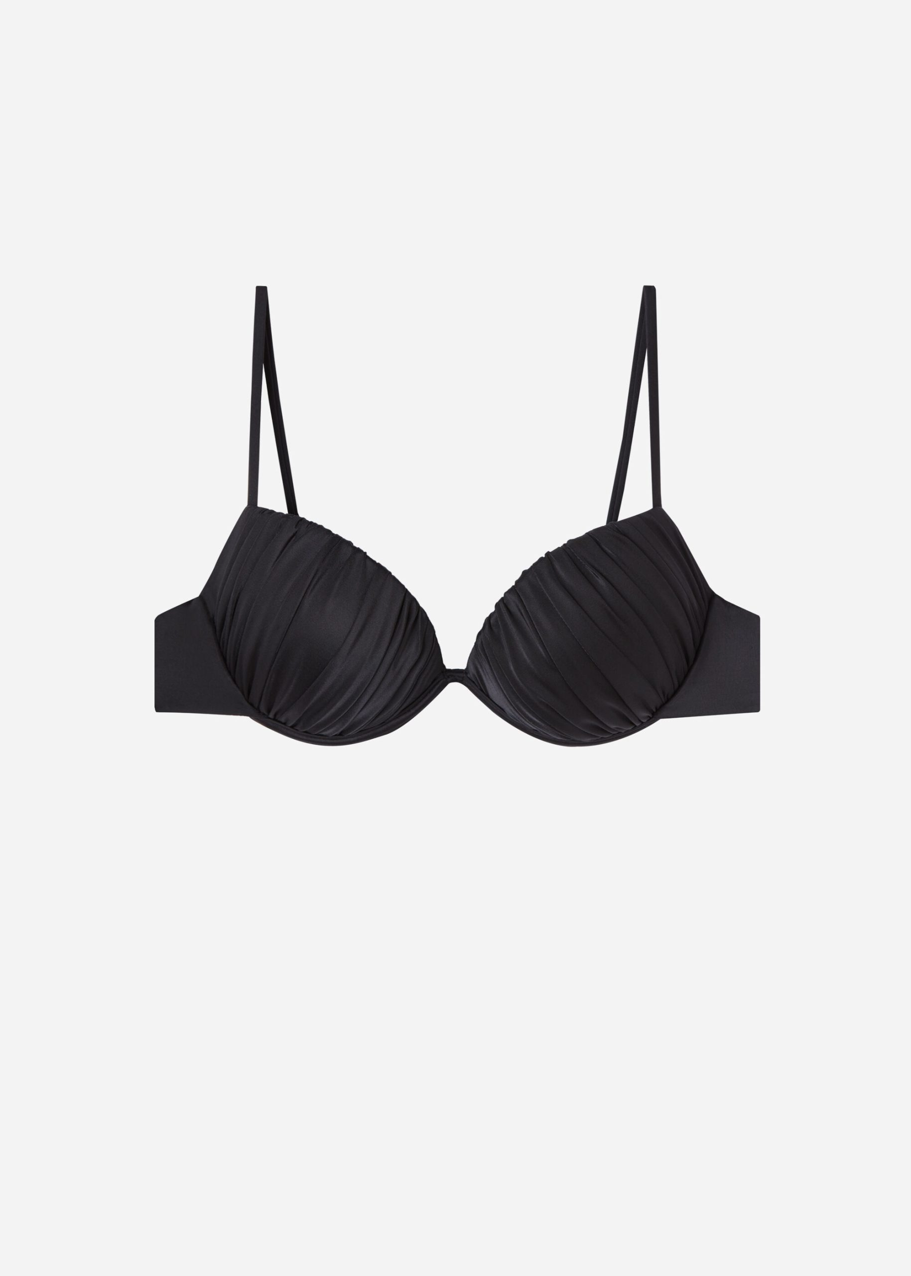 Push-up underwire bikini top with especially soft, graduated padded cups. The style features a bright fabric with a silky effect with ruffles. Adjustable straps and back tie closure.
