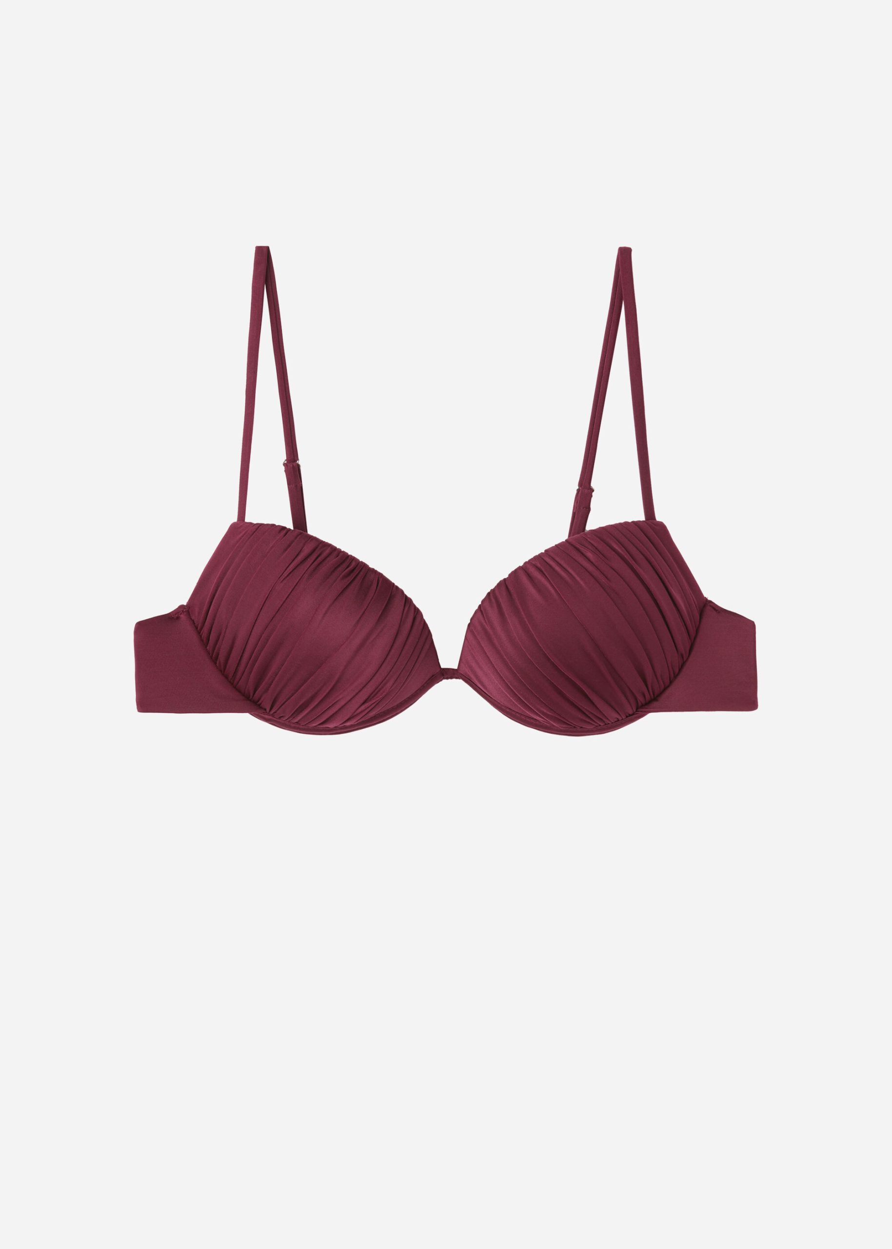 Push-up underwire bikini top with especially soft, graduated padded cups. The style features a bright fabric with a silky effect with ruffles. Adjustable straps and back tie closure.