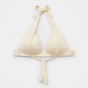 Wireless fixed triangle bikini top with graduated padded cups that add volume to enhance the décolleté. The style features a bright fabric with a silky effect, embellished by ruffles. The shoulder straps have eyelets on the ends so they can be hooked onto the back band or tied behind the neck. Back tie closure.