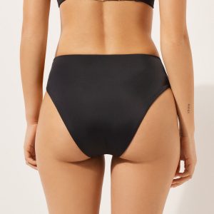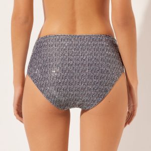 Bikini bottom with a high waist with a shaping effect on the abdomen, guaranteed by a special tulle at the front. The style features a black and white toned pattern embellished with a coated effect. Fully lined with invisible seams.