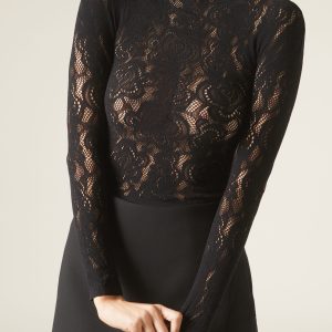 Floral motif mesh top with macramé effect to pair with coordinating tights MODC2150. It features a funnel neckline and long sleeves, providing an elegant and sophisticated look.