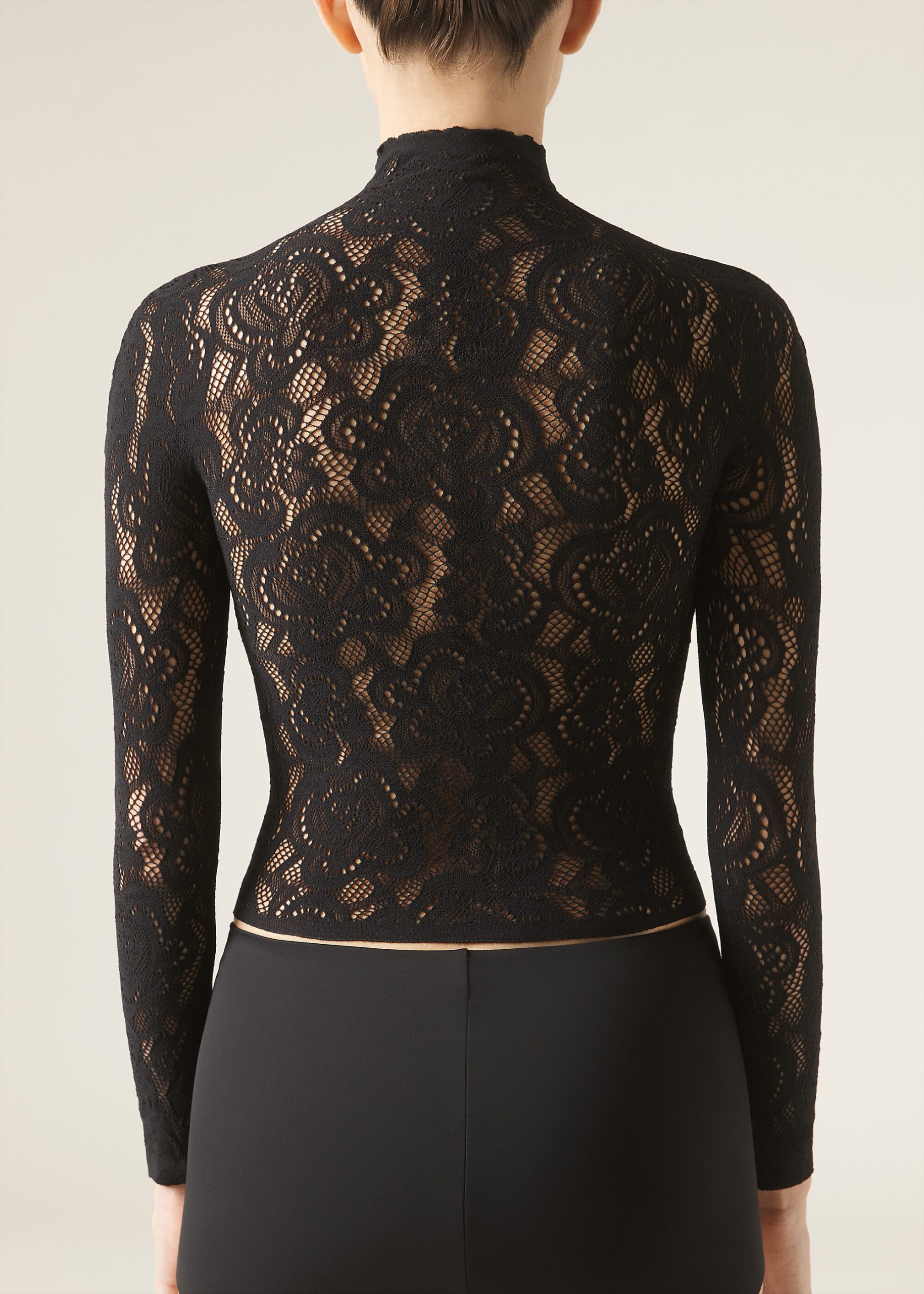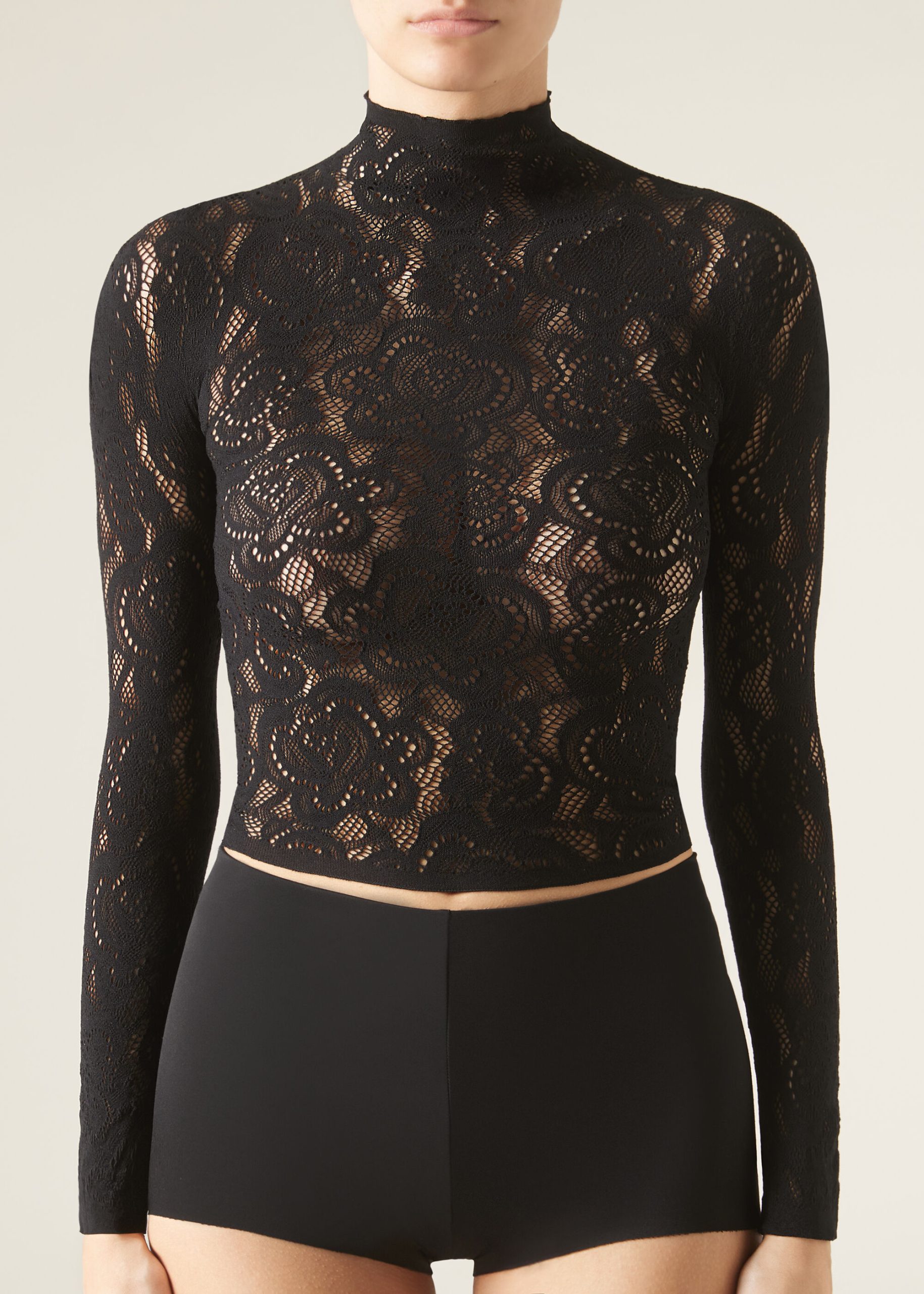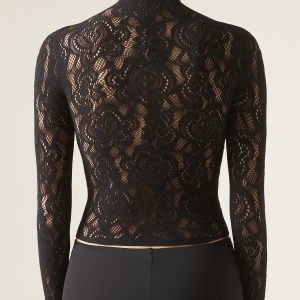 Floral motif mesh top with macramé effect to pair with coordinating tights MODC2150. It features a funnel neckline and long sleeves, providing an elegant and sophisticated look.