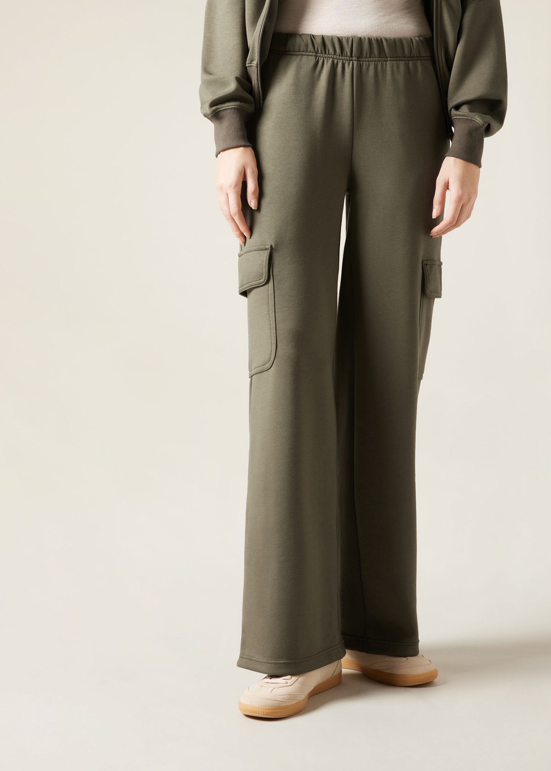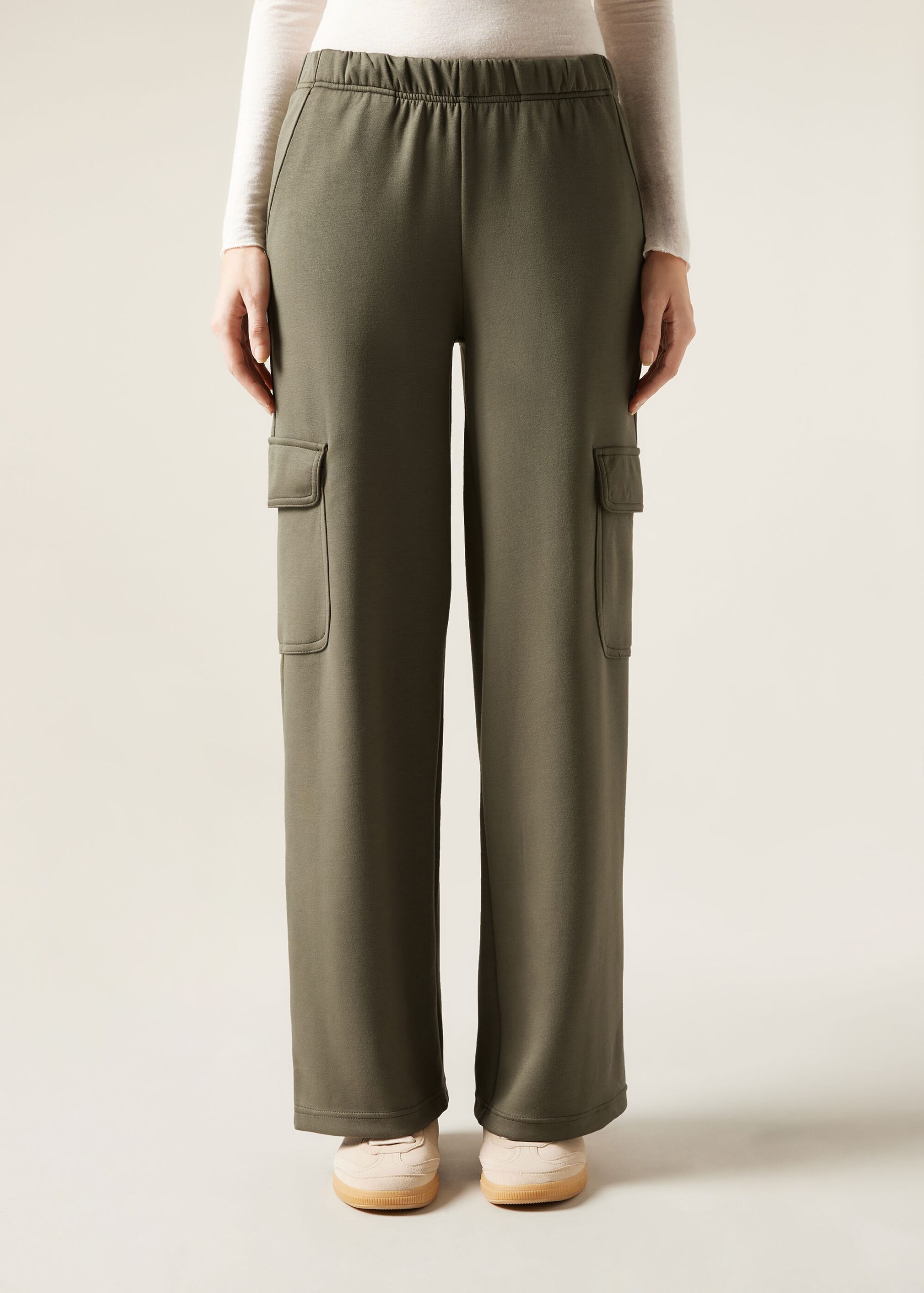 Cargo pants in high quality soft touch modal blend fabric, extremely supple and comfortable to the touch. Feature an elastic waistband and practical cargo-style patch pockets, they combine elegance and functionality for a modern and versatile look.