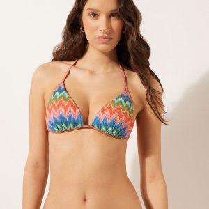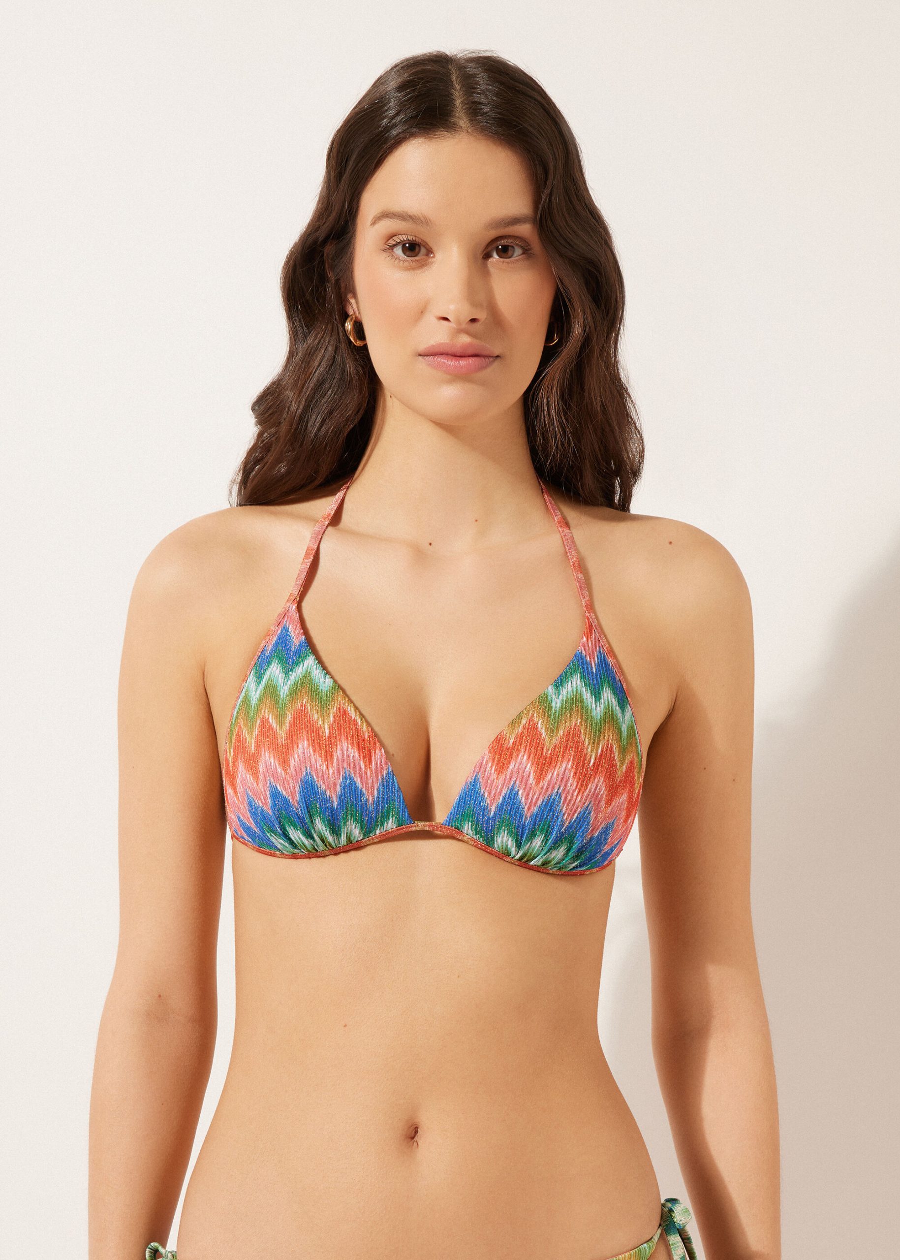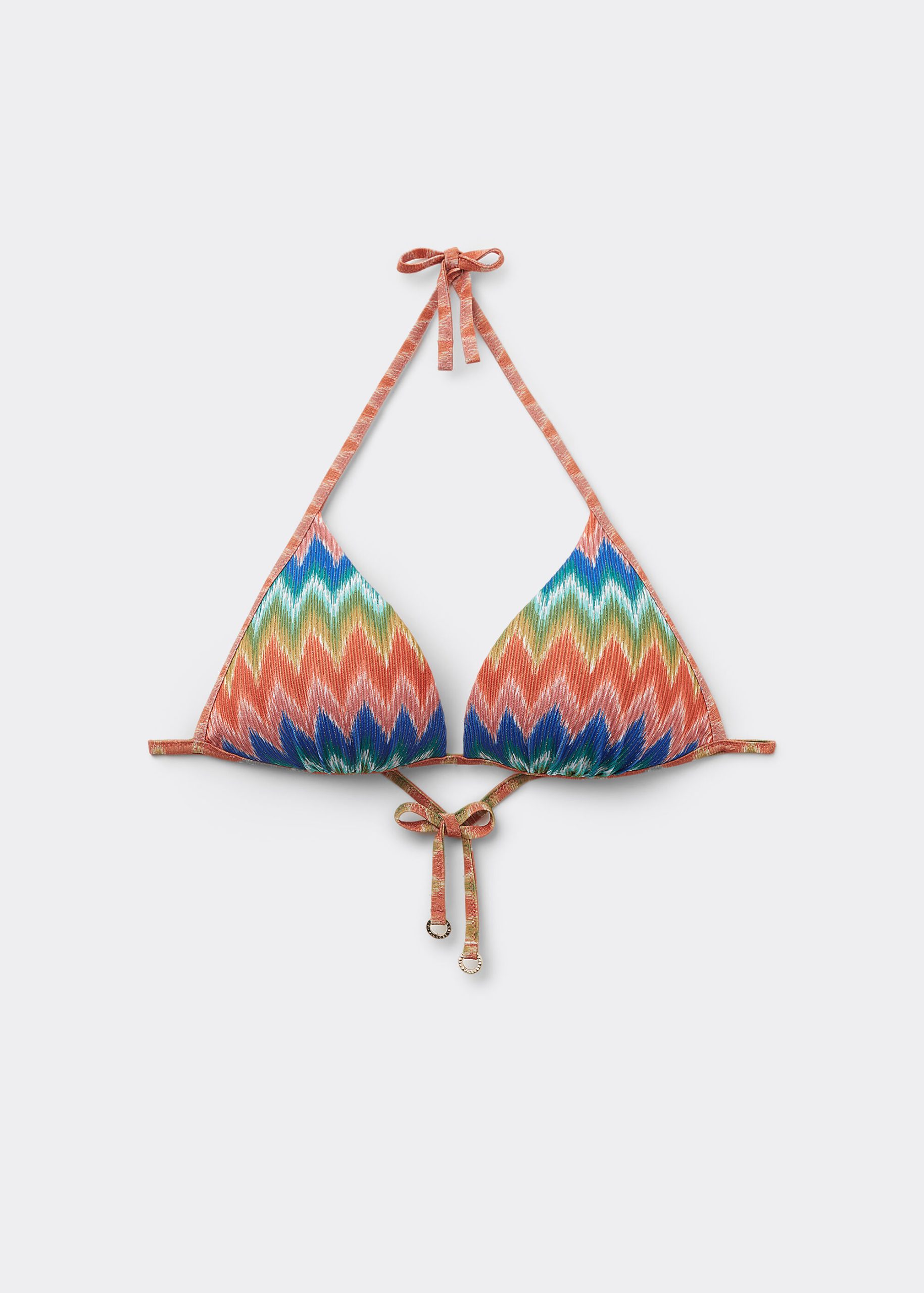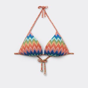 Fixed triangle bikini top with no underwire and with graduated padded cups that add volume to enhance the décolleté. A dynamic and sophisticated chevron motif, in bright colors on slightly ruched fabric, perfect for a modern and refined look. The shoulder straps have eyelets on the ends so they can be hooked onto the back band or tied behind the neck. Back string tie closure.
