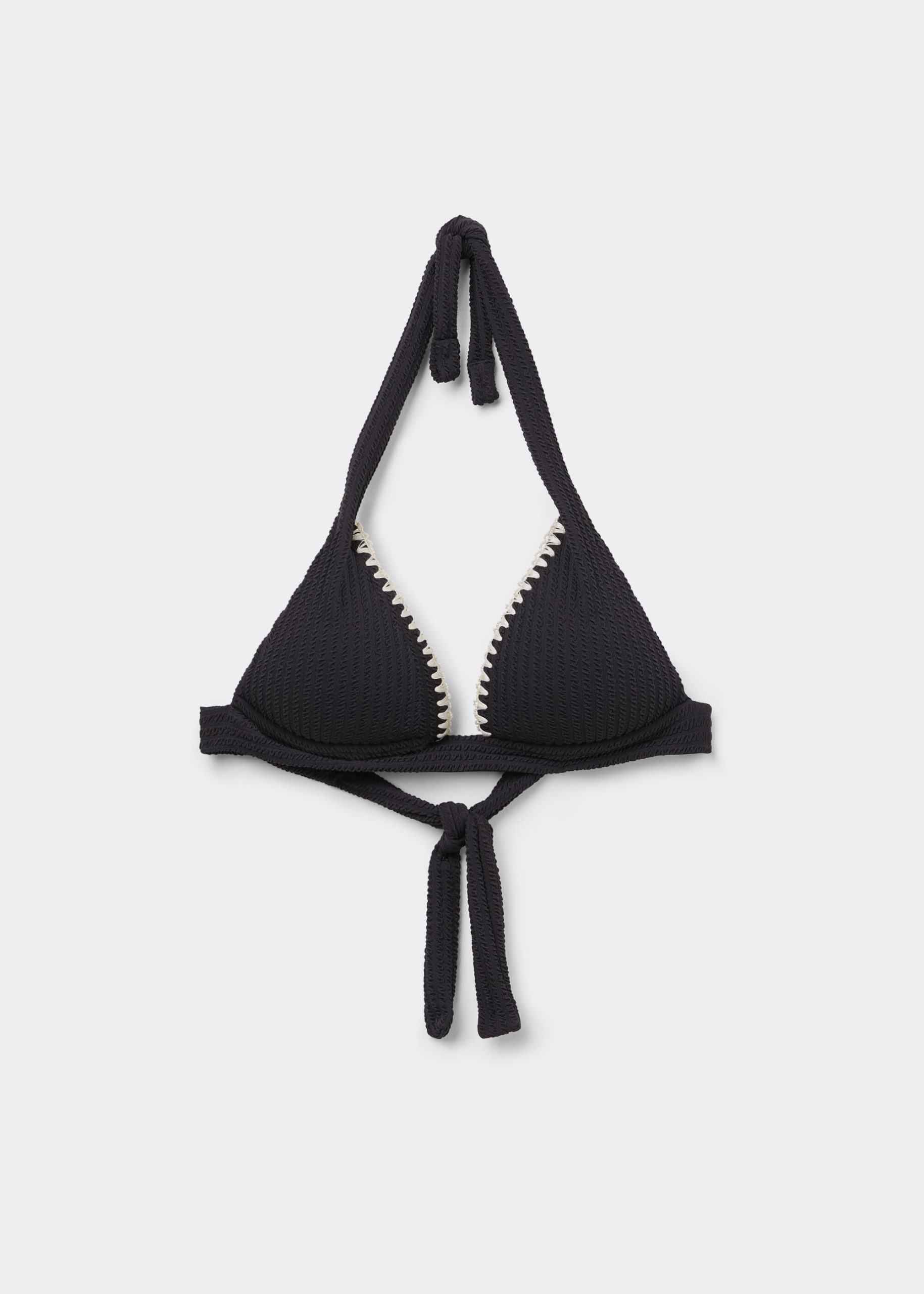 Wireless fixed triangle bikini top with graduated padded cups that add volume to enhance the décolleté. The style features a crinkle fabric embellished with contrast color embroidery. The shoulder straps have eyelets on the ends so they can be hooked onto the back band or tied behind the neck. Back tie closure.