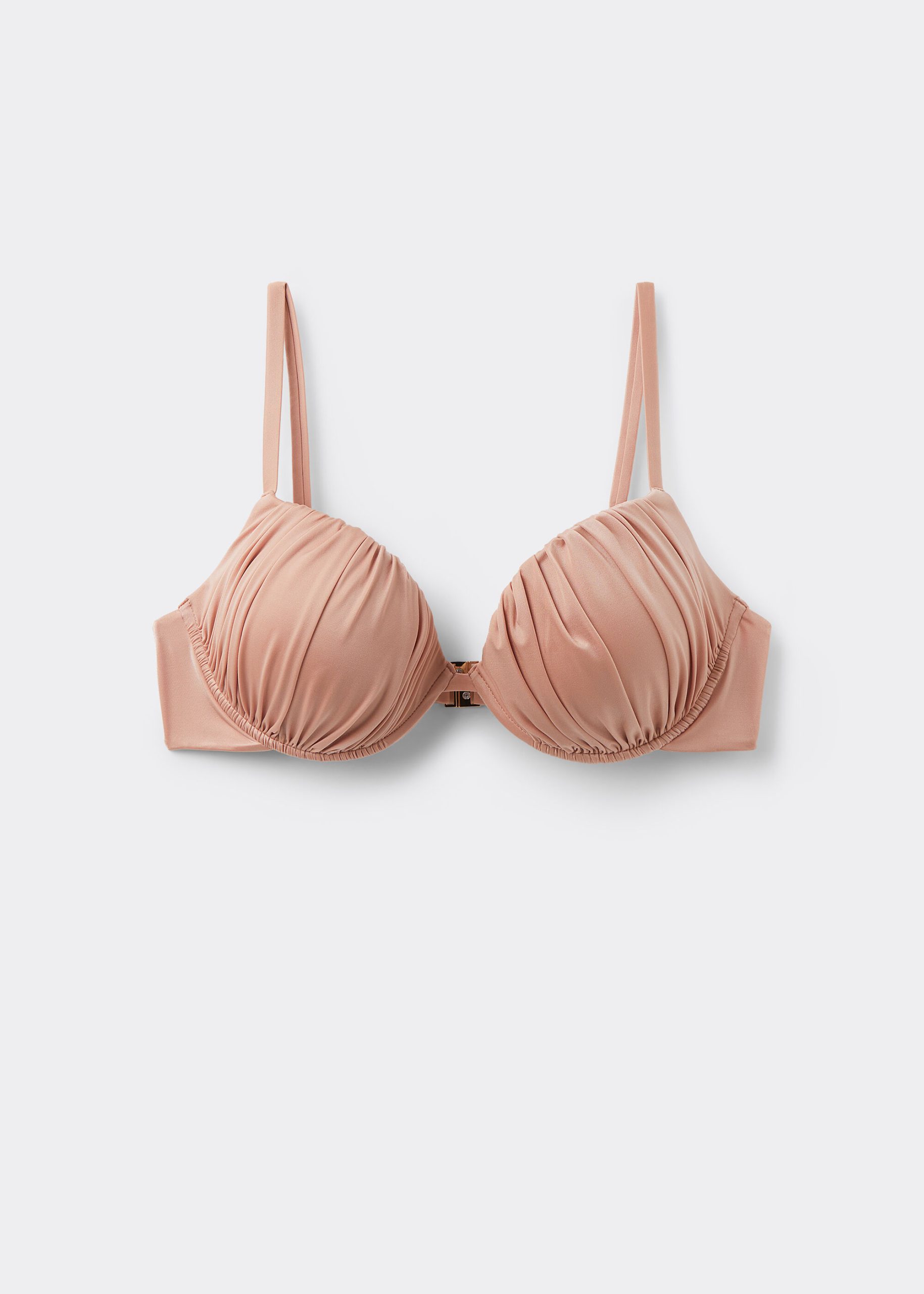 Push-up bikini top with lightly padded cups and underwire to guarantee support and provide volume. The style features a bright fabric with a silky effect. Fixed Shoulder Straps. Rear closure with double adjustment hook.
