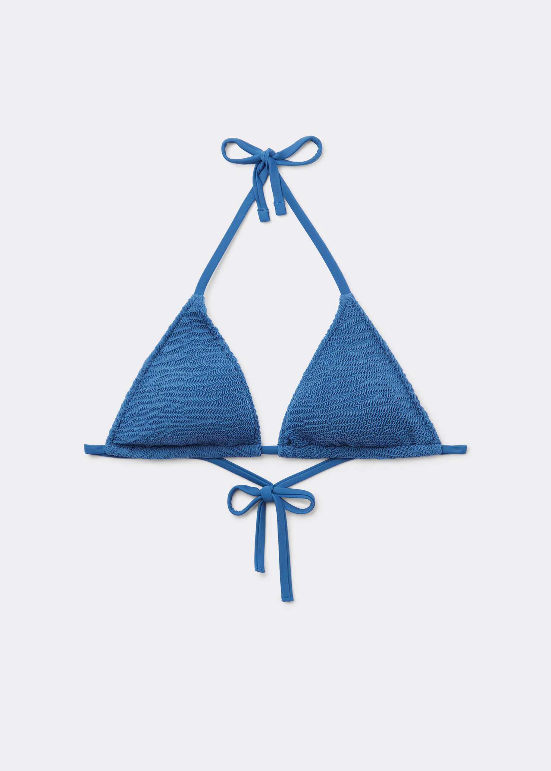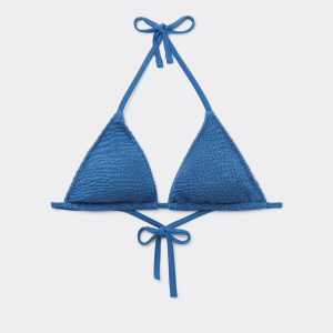 Slide triangle bikini top with removable cups and no underwire for a natural effect. The style features a crinkle fabric with a three-dimensional effect. The shoulder straps have eyelets on the ends so they can be hooked onto the back band or tied behind the neck. Back string tie closure.