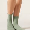 Women’s short ribbed cotton socks with romantic trim detailing.