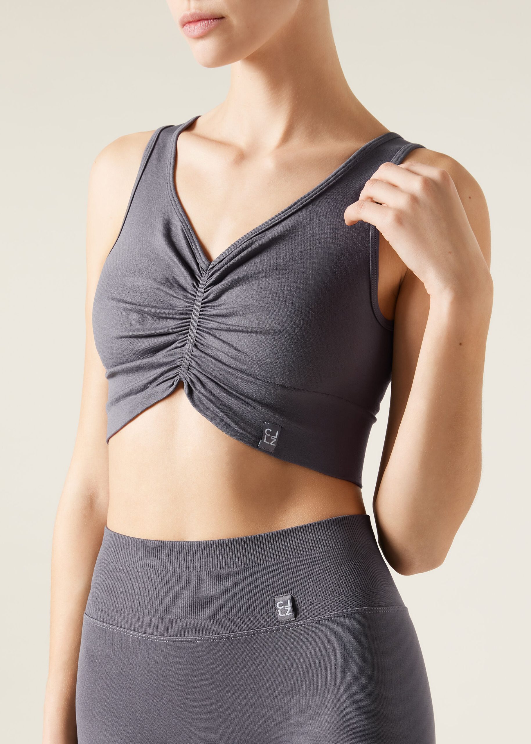 Sleeveless top with V-neckline and wide shoulder straps, enhanced by an elegant crimping in the center of the bust. Made from a soft stretch fabric, it offers the perfect balance between comfort and style. Ideal for training or for completing a casual look. Perfectly pairs with leggings MODP1252 or other workout styles.