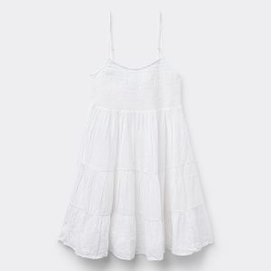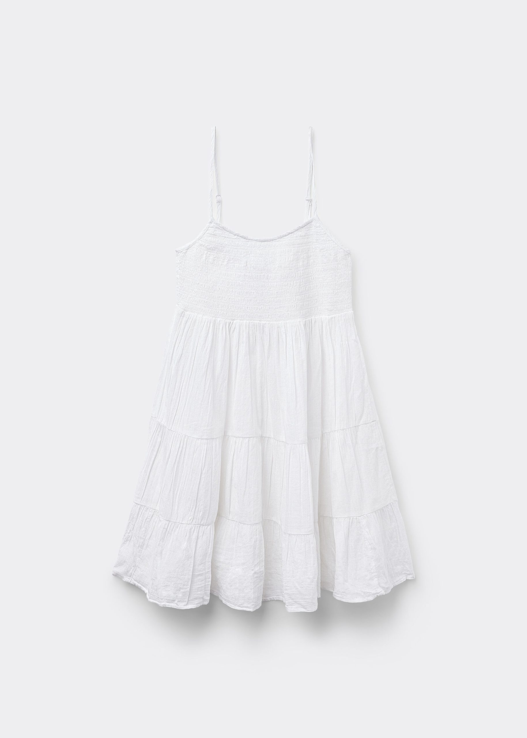 Short cotton dress with thin adjustable shoulder straps and smocked bodice that creates a gathered and stretch effect, providing a comfortable and snug fit. Full above-the-knee length ruffle skirt.