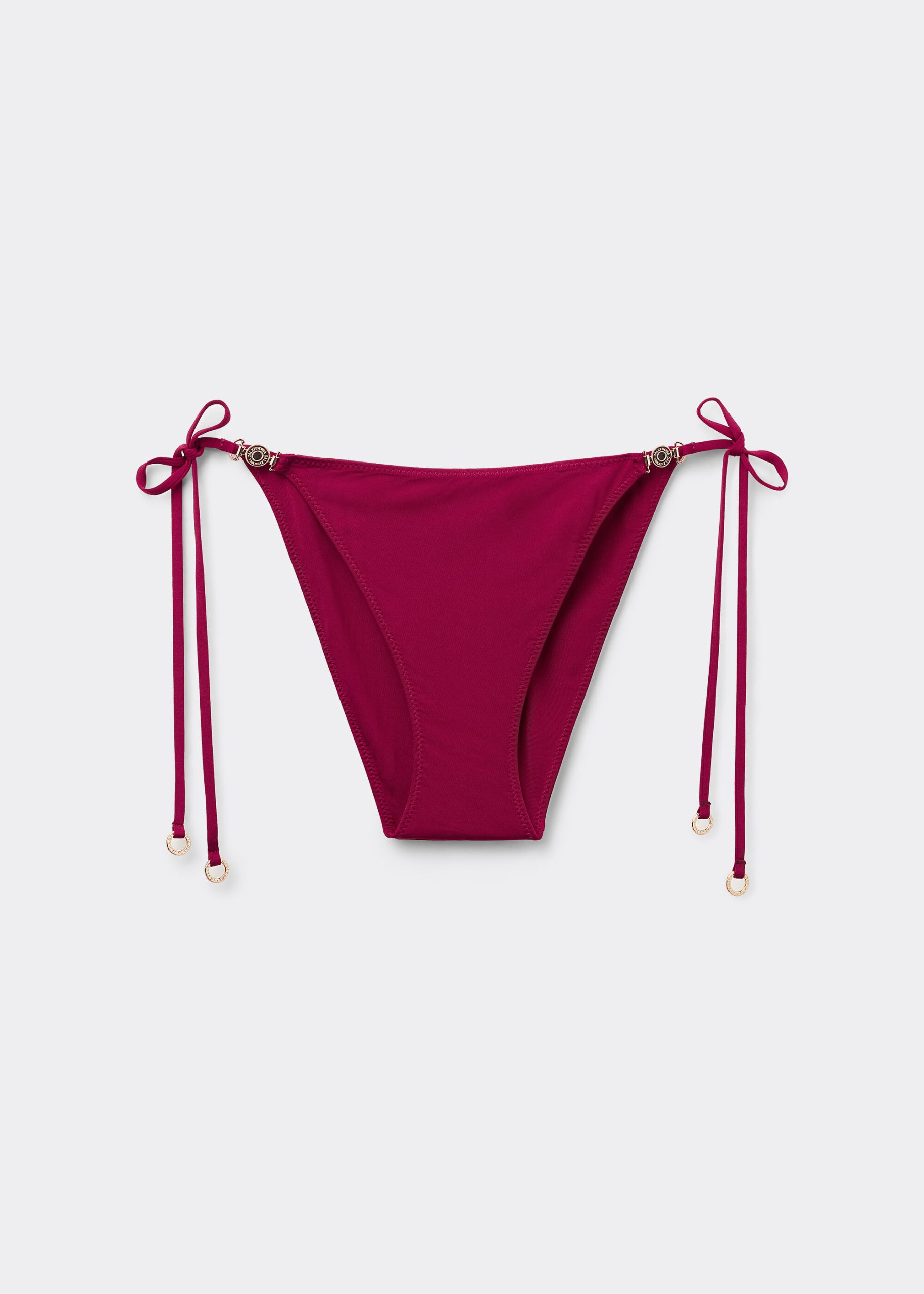 String bikini bottoms with side ties to adjust the fit. The slightly rounded waist at the front allows for both a regular and more high-cut fit, depending on one’s physique. It features a minimal fit that exalts the silhouette with a touch of sensuality and refinement. The bright silk-effect fabric embellished by elegant golden details radiates a sophisticated sensation of discrete luxury.