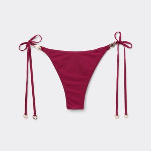 Thong bikini bottoms with side string ties to adjust the fit. It features a minimal fit that exalts the silhouette with a touch of sensuality and refinement. The slightly rounded waist at the front allows for both a regular and more high-cut fit, depending on one’s physique. The bright silk-effect fabric embellished by elegant golden details radiates a sophisticated sensation of discrete luxury. Fully lined with invisible seams.