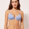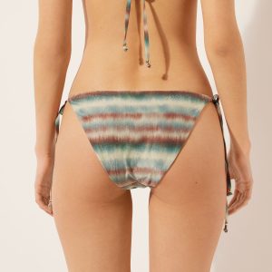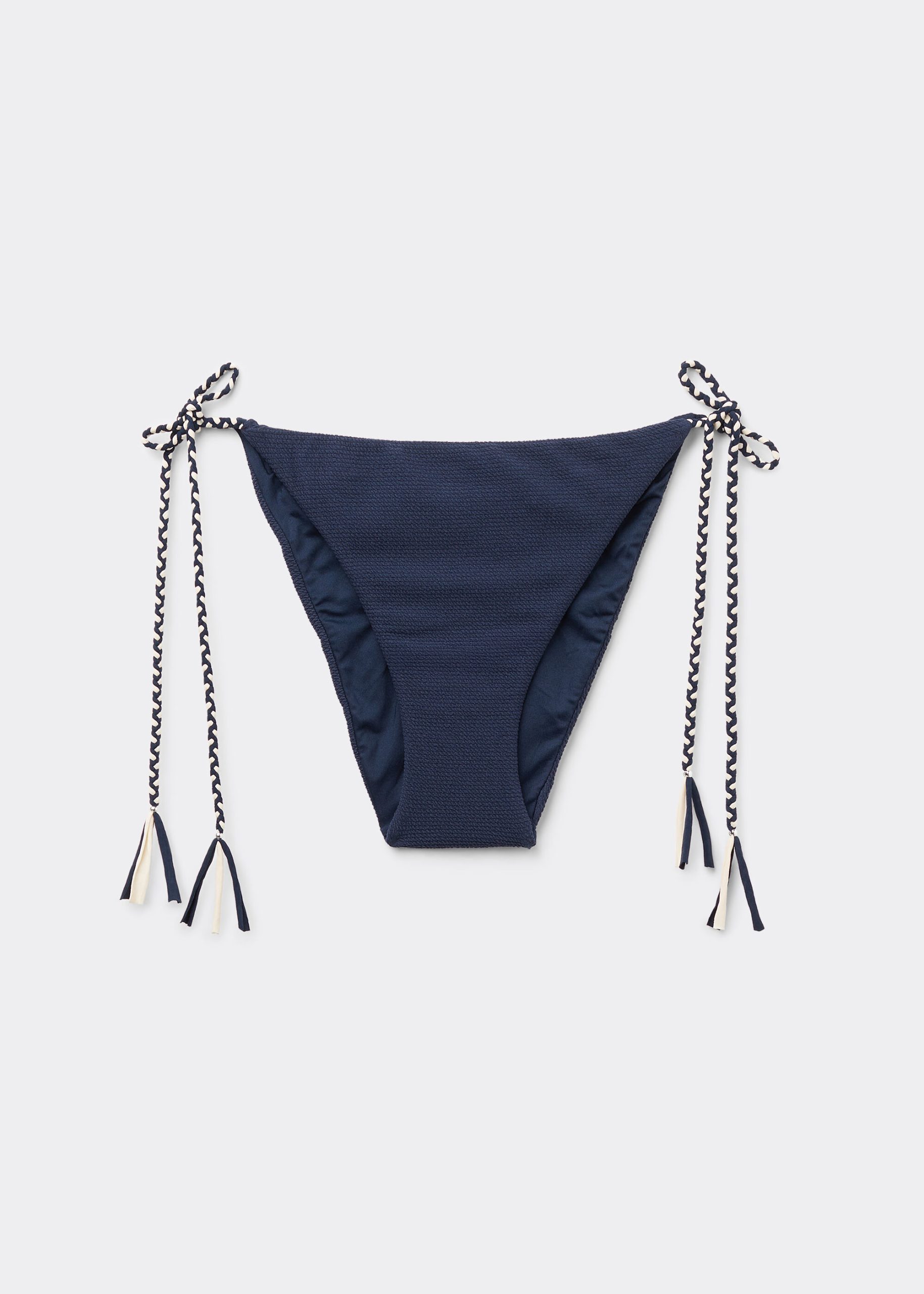 Bikini bottoms with side ties featuring a two-toned braid to adjust the fit. The slightly rounded waist at the front allows for both a classic or more high-cut fit, depending on one’s physique. The style is defined by a three-dimensional monochrome fabric with a slightly crinkled texture that adds depth and sophistication. Fully lined with invisible seams.
