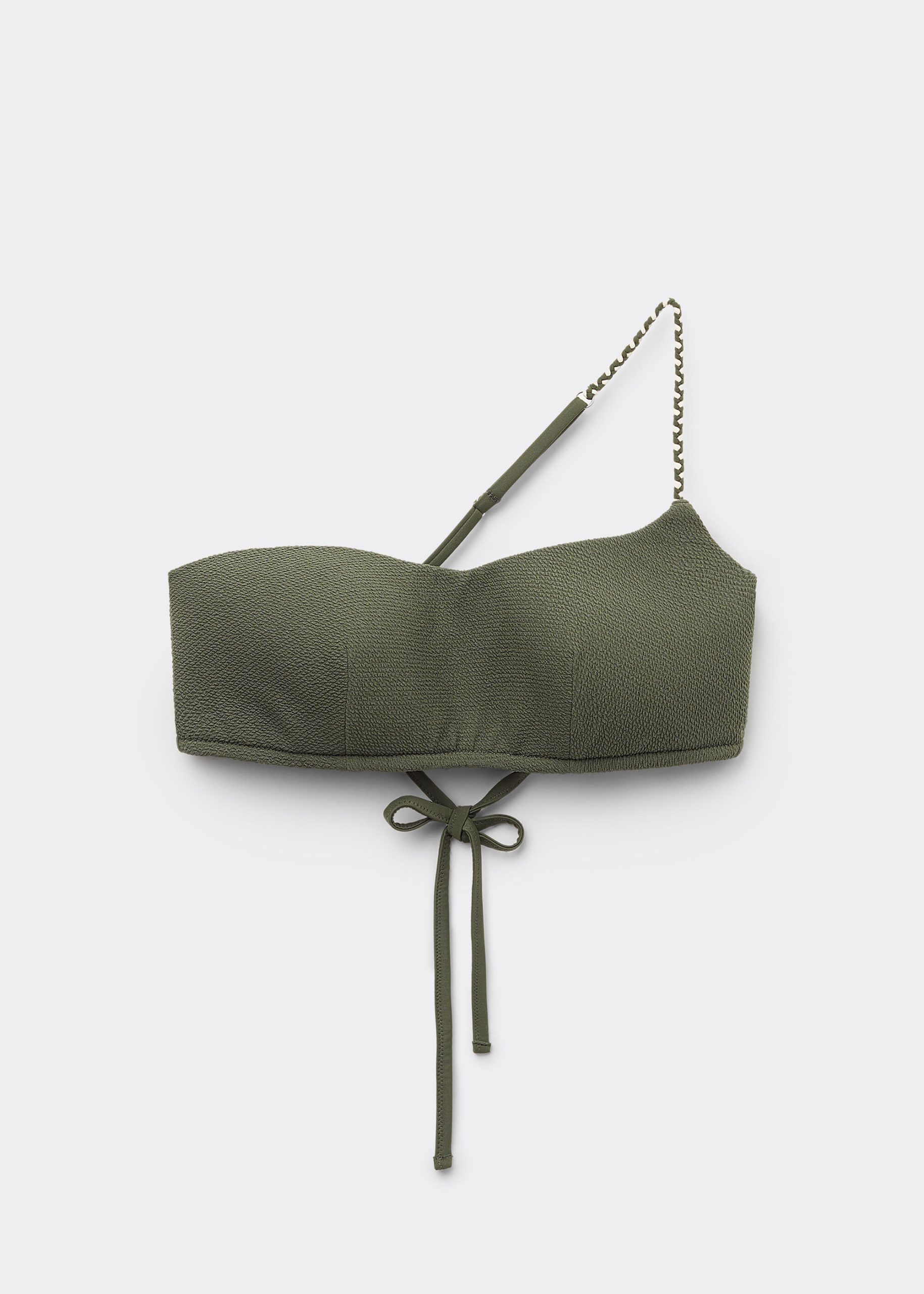Wireless single strap bikini top with light padding that softly shapes the bust. The 3D crinkled fabric, enriched by a braided string, provides a touch of sophisticated elegance. The side boning ensures excellent support, while the string tie fastening at the back completes the design for this distinctive, modern and feminine summer look.
