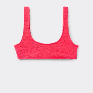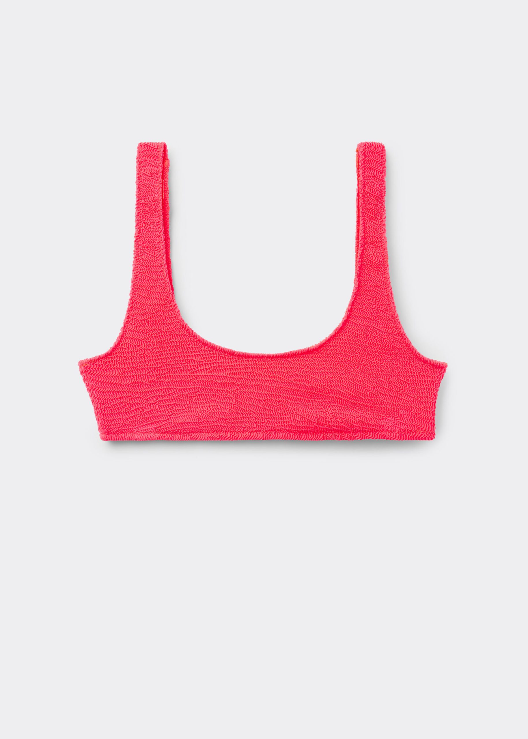Sporty tank-style bikini top with no padding or underwire for a natural effect. The style features a crinkle fabric with a three-dimensional effect. Fixed straps and closed back.