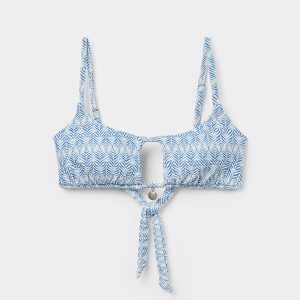 Tank-style bikini top with light padding, no underwire and opening in the center. A refined geometric pattern in delicate shades of white and blue, embellished by micro-beads that add a touch of elegance and sophistication. The side boning helps support the bust. Adjustable thin straps. Back tie closure.