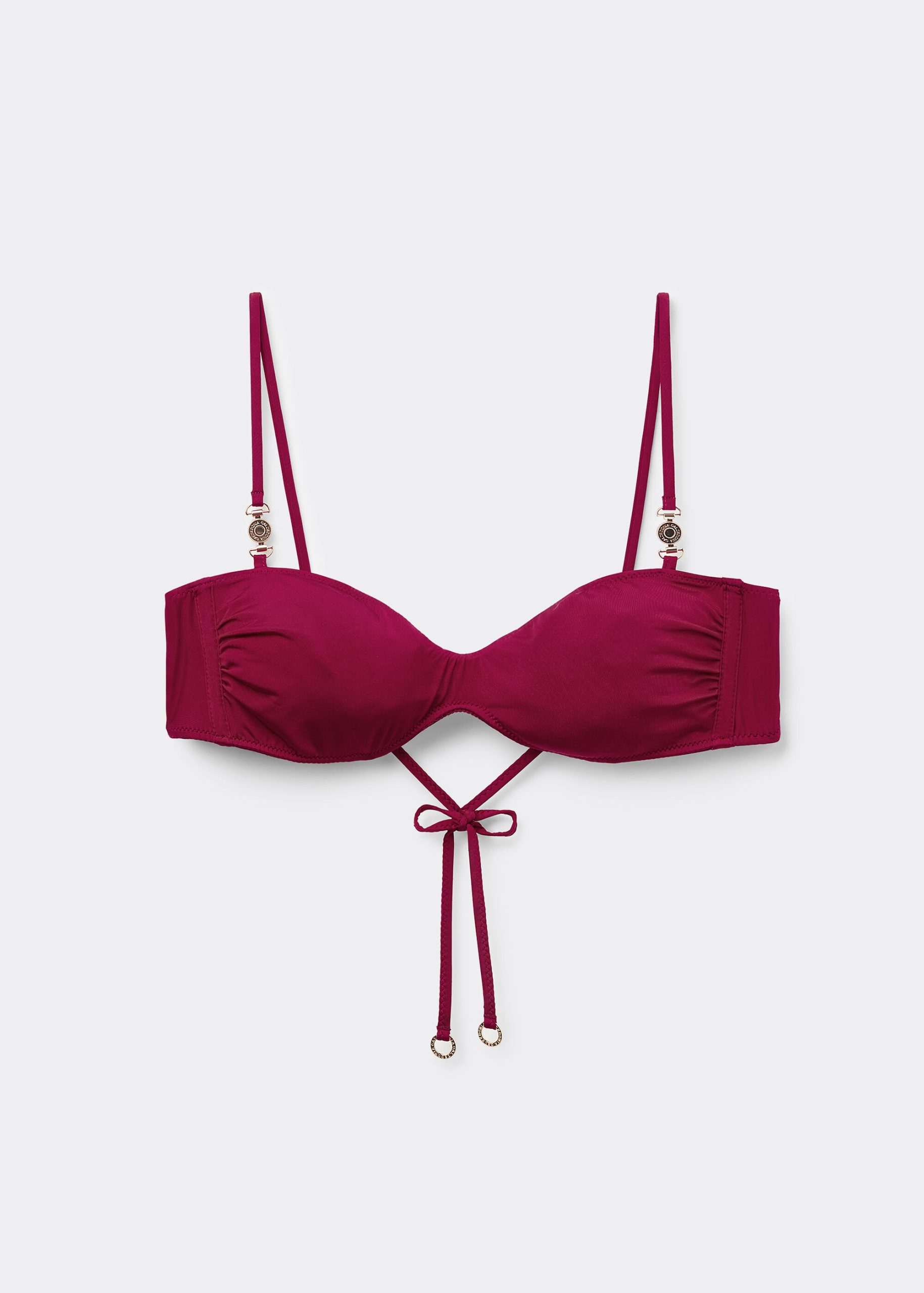 Tank style bikini top, wireless and unpadded for a natural effect. It features a minimal fit that exalts the silhouette with a touch of sensuality and refinement. The bright silk-effect fabric embellished by elegant golden details radiates a sophisticated sensation of discrete luxury. Adjustable shoulder straps and string tie fastening complete the design for this summer look that does not pass by unnoticed.