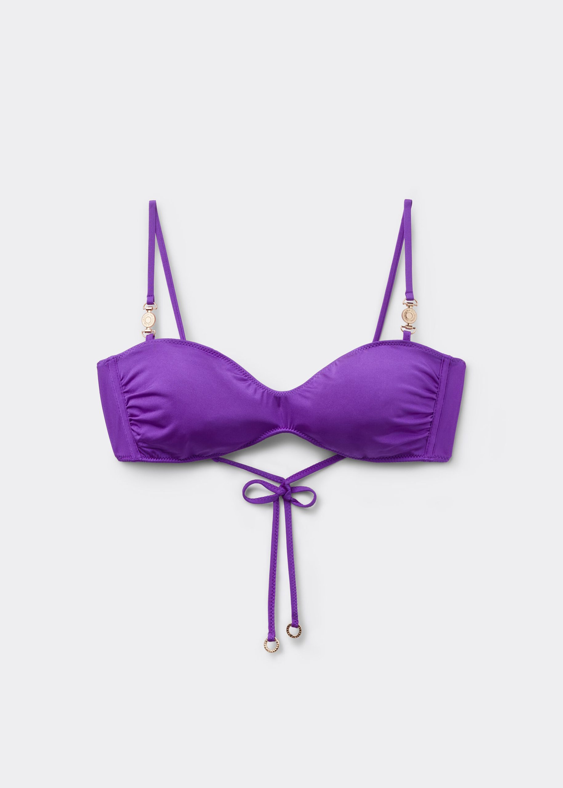 Tank style bikini top, wireless and unpadded for a natural effect. It features a minimal fit that exalts the silhouette with a touch of sensuality and refinement. The bright silk-effect fabric embellished by elegant golden details radiates a sophisticated sensation of discrete luxury. Adjustable shoulder straps and string tie fastening complete the design for this summer look that does not pass by unnoticed.
