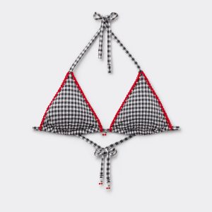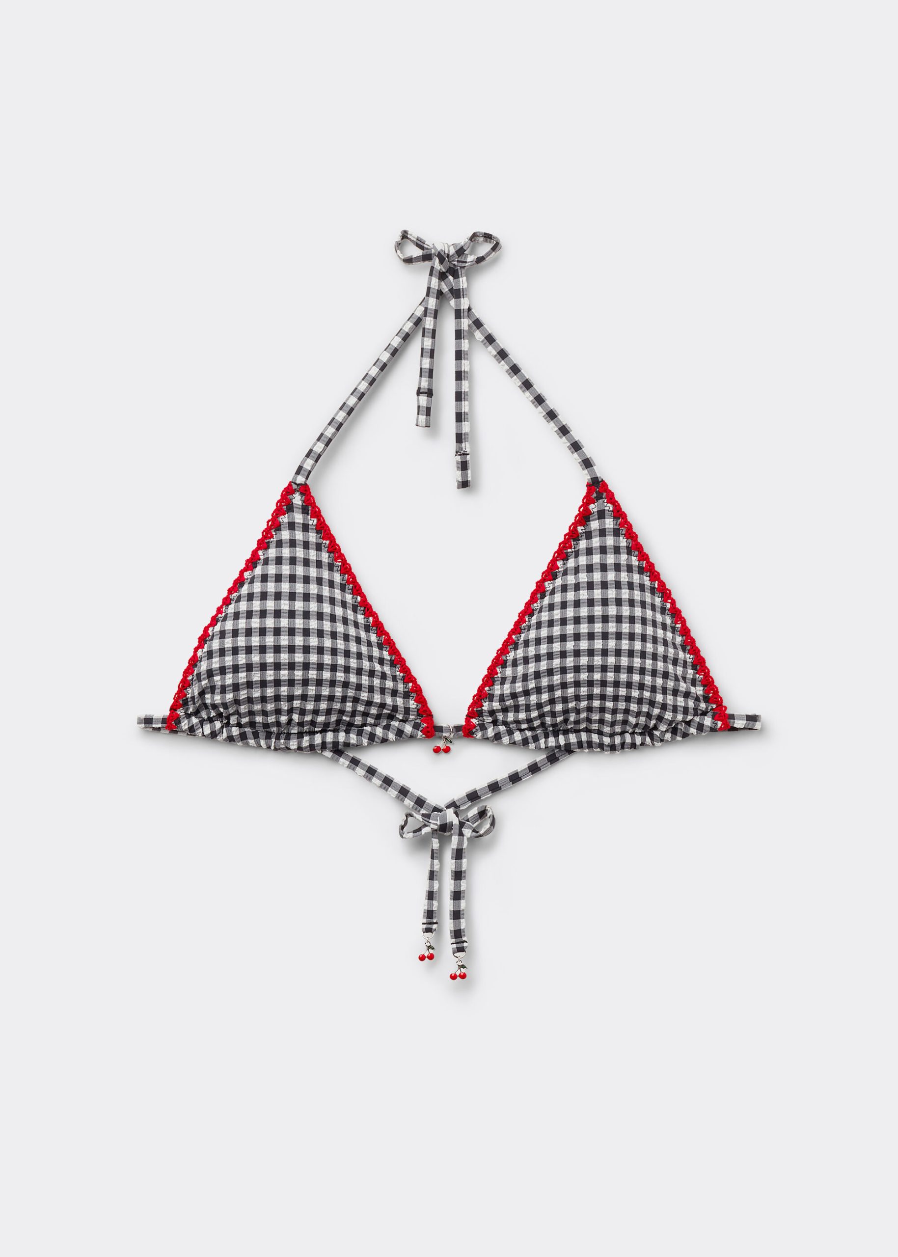 Slide triangle bikini top with removable padding, wireless for a natural effect. Enriched by an elegant cherries accessory on the center front gore, the top is made from patterned vichy fabric and is embellished by a delicate red trim that exalts its design with a touch of sophistication. The straps have an eyelet at the end, offering the possibility to insert them on the underband or tied behind the neck for a personalized fit. Back string tie closure for a perfect fit.