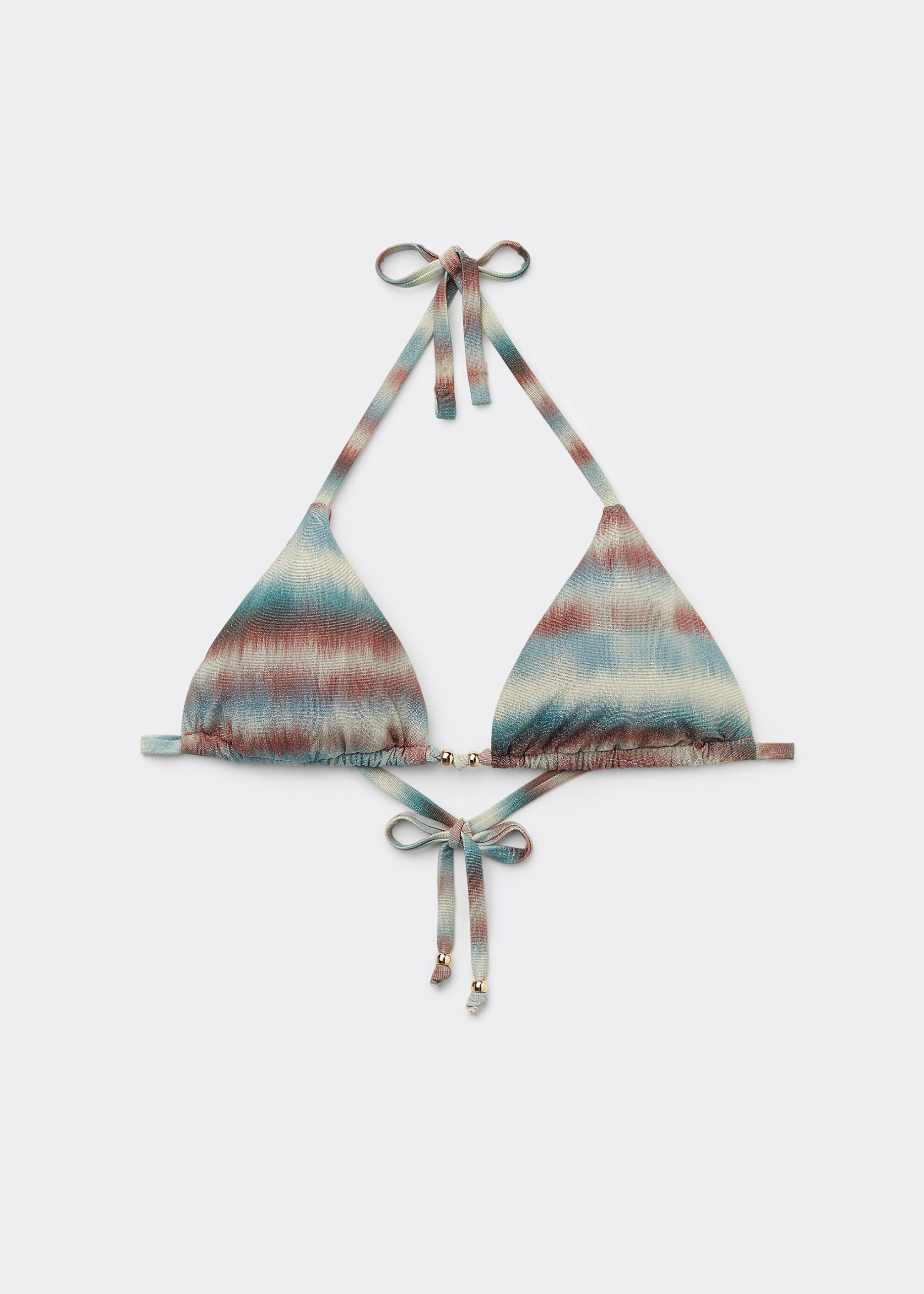 Slide triangle bikini top with removable padding, wireless for a natural effect. Bright and colorful tie-dye motif embellished with glittery details, on a soft and shimmery fabric, ideal for a bold and original look. The shoulder straps have eyelets on the ends so they can be hooked onto the back band or tied behind the neck. Back string tie closure.