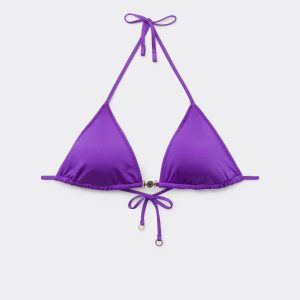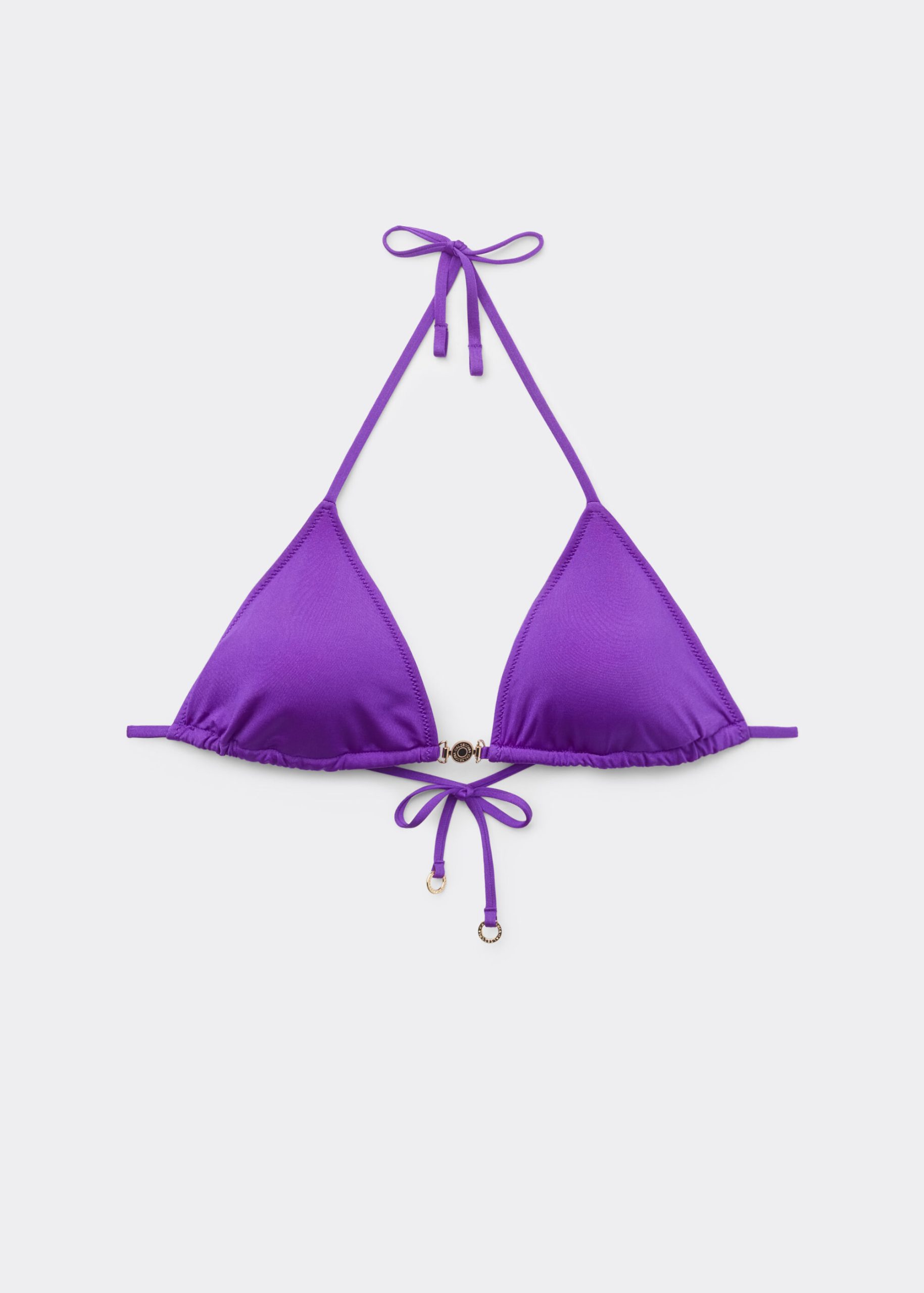 Slide triangle style bikini top with removable padding, wireless, featuring a minimal fit that exalts the silhouette with a touch of sensuality and refinement. The bright silk-effect fabric embellished by elegant golden details radiates a sophisticated sensation of discrete luxury. The straps have an eyelet at the end to insert them on the underband or fasten behind the neck, while the string tie fastening on the back guarantees an adjustable fit. Perfect for a sophisticated and irresistible summer look.